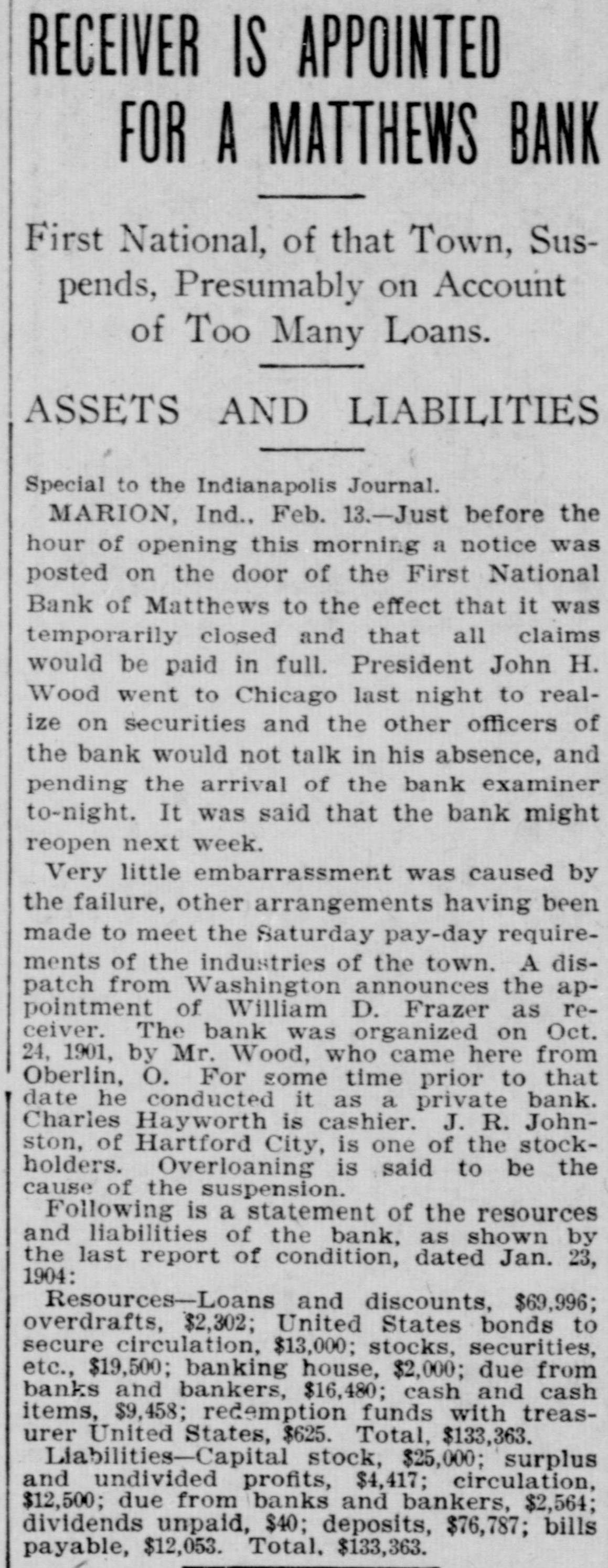 RECEIVER IS APPOINTED FOR A MATTHEWS BANK First National, of that Town, Suspends, Presumably on Account of Too Many Loans. ASSETS AND LIABILITIES Special to the Indianapolis Journal. MARION, Ind.. Feb. 13.-Just before the hour of opening this morning a notice was posted on the door of the First National Bank of Matthews to the effect that it was temporarily closed and that all claims would be paid in full. President John H. Wood went to Chicago last night to realize on securities and the other officers of the bank would not talk in his absence, and pending the arrival of the bank examiner to-night. It was said that the bank might reopen next week. Very little embarrassment was caused by the failure, other arrangements having been made to meet the Saturday pay-day requirements of the industries of the town. A dispatch from Washington announces the appointment of William D. Frazer as receiver. The bank was organized on Oct. 24, 1901, by Mr. Wood, who came here from Oberlin, O. For some time prior to that date he conducted it as a private bank. Charles Hayworth is cashier. J. R. Johnston, of Hartford City, is one of the stockholders. Overloaning is said to be the cause of the suspension. Following is a statement of the resources and liabilities of the bank, as shown by the last report of condition, dated Jan. 23, 1904: Resources-Loans and discounts, $69,996; overdrafts, $2,302; United States bonds to secure circulation, $13,000; stocks, securities, etc., $19,500; banking house, $2,000; due from banks and bankers, $16,480; cash and cash items, $9,458; redemption funds with treasurer United States, $625. Total, $133,363. Liabilities-Capital stock, $25,000; surplus and undivided profits, $4,417; circulation, $12,500; due from banks and bankers, $2,564; dividends unpaid, $40; deposits, $76,787; bills payable, $12,053. Total, $133,363.