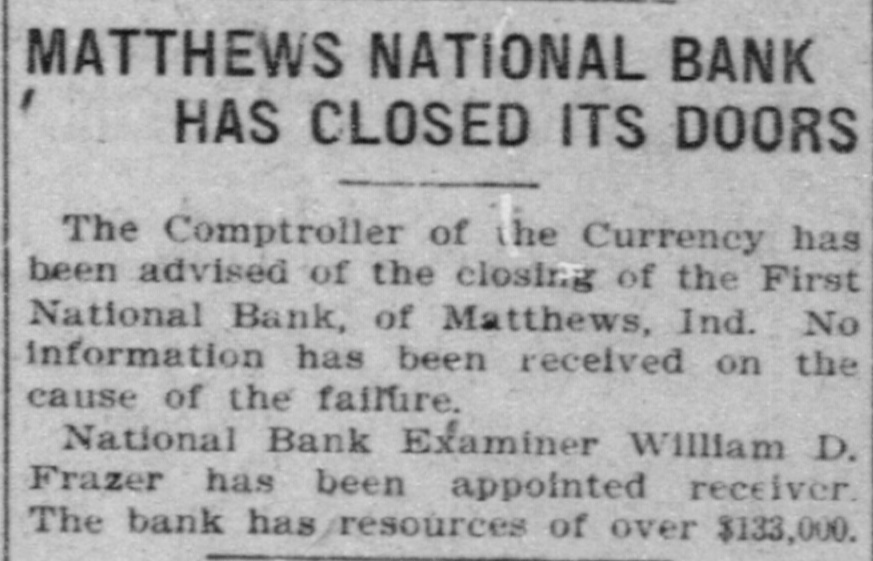 MATTHEWS NATIONAL BANK HAS CLOSED ITS DOORS The Comptroller of the Currency has been advised of the closing of the First National Bank, of Matthews, Ind. No information has been received on the cause of the failure. National Bank Examiner William D. Frazer has been appointed receiver The bank has resources of over $133,000.