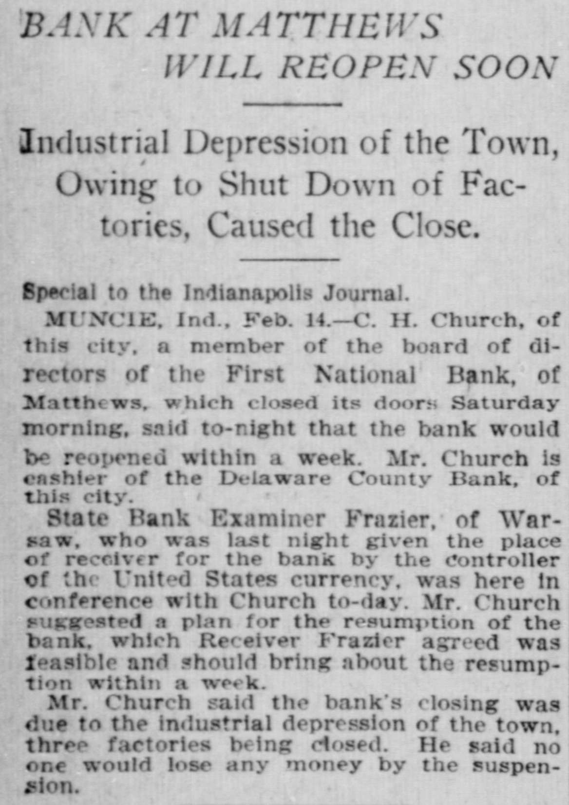BANK AT MATTHEWS WILL REOPEN ,SOON Industrial Depression of the Town, Owing to Shut Down of Factories, Caused the Close. Special to the Indianapolis Journal. MUNCIE, Ind., Feb. 14.-C. H. Church, of this city, a member of the board of directors of the First National Bank, of Matthews, which closed its doors Saturday morning, said to-night that the bank would be reopened within a week. Mr. Church is eashier of the Delaware County Bank, of this city. State Bank Examiner Frazier, of Warsaw, who was last night given the place of receiver for the bank by the controller of the United States currency, was here in conference with Church to-day. Mr. Church suggested a plan for the resumption of the bank, which Receiver Frazier agreed was feasible and should bring about the resumption within a week. Mr. Church said the bank's closing was due to the industrial depression of the town, three factories being closed. He said no one would lose any money by the suspension.