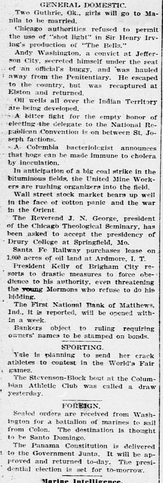# GENERAL DOMESTIC. Two Guthrie, Ok., girls will go to Manila to be married. Chicago authorities refused to permit the use of "shot light" in Sir Henry Irving's production of "The Bells." Andy Washington, a convict at Jefferson City, secreted himself under the seat of an official's buggy, and was hauled away from the Penitentiary. He escaped to the country, but was recaptured at Elston and returned. Oil wells all over the Indian Territory are being developed. A bitter fight for the empty honor of electing-the delegate to the National Republican Convention is on between St. Joseph factions. A. Columbia bacteriologist announces that hogs can be made immune to cholera by inoculation. In anticipation of a big coal strike in the bituminous fields, the United Mine Workers are rushing organizers into the field. Wall street stock market bears up well in the face of cotton panic and the war in the Orient. The Reverend J. N. George, president of the Chicago Theological Seminary, has been asked to accept the presidency of Drury College at Springfield, Mo. Santa Fe Railway purchases lease on 1,000 acres of oil land at Ardmore, I. T. President Kelly of Brigham City resorts to drastic measures to force obedience to his authority, even threatening the young Mormons who refuse to do his bidding. The First National Bank of Matthews, Ind., it is reported, will be opened within a week. Bankers object to ruling requiring owners' names to be stamped on bonds. # SPORTING. Yale is planning to send her crack athletes to contest in the World's Fair games. The Stevenson-Block bout at the Columbian Athletic Club was called a draw yesterday. # FOREIGN. Sealed orders are received from Washington for a battalion of marines to sail from Colon. The destination is thought to be Santo Domingo. The Panama Constitution is delivered to the Government Junta. It will be approved and returned to-day. The presidential election is set for to-morrow. Marine Intelligence.
