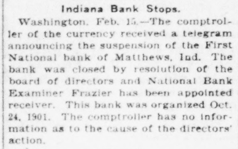 Indiana Bank Stops. Washington. Feb. 16-The comptroller of the currency received a telegram announcing the suspension of the First National bank of Matthews, Ind. The bank was closed by resolution of the board of directors and National Bank Examiner Frazier has been appointed receiver. This bank was organized Oct. 24, 1901. The comptroller has no Information as to the cause of the directors' action.