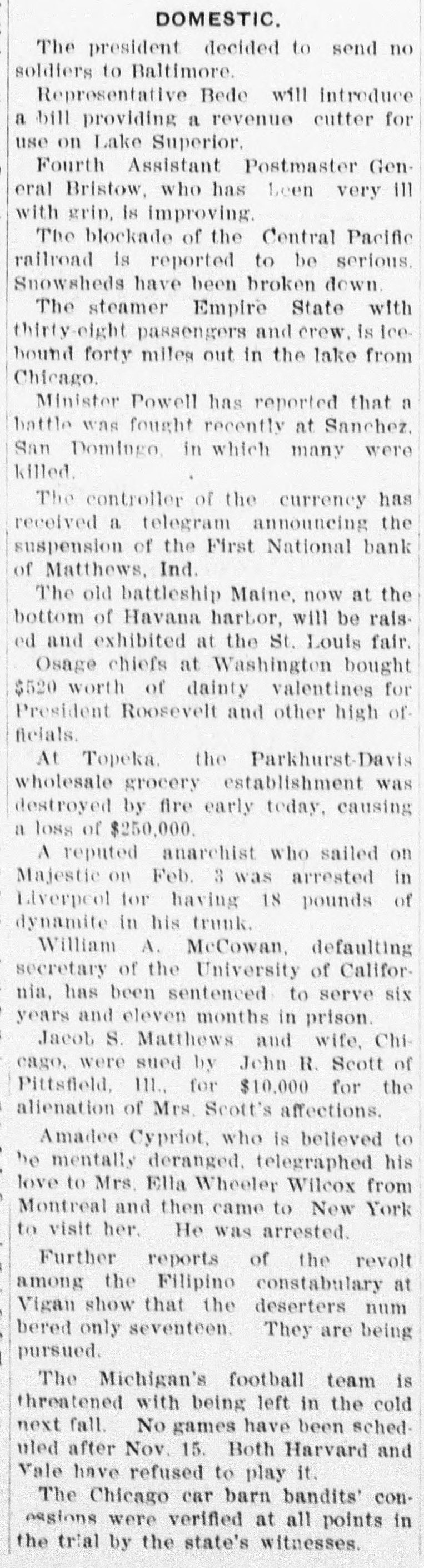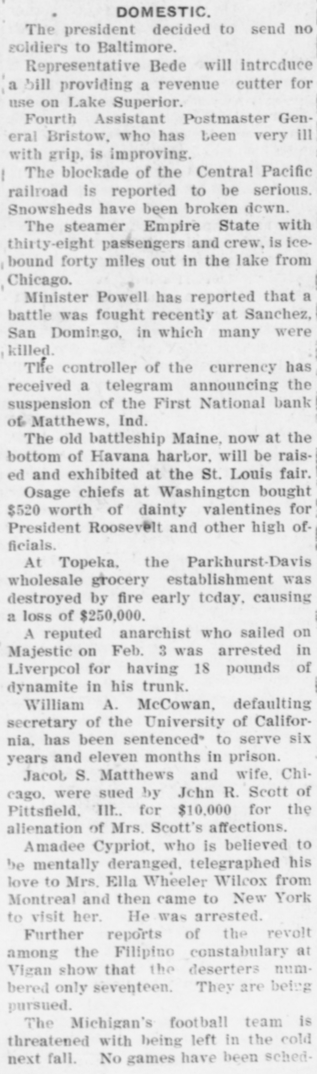 DOMESTIC. The president decided to send no soldiers to Baltimore. Representative Bede will introduce a bill providing a revenue cutter for use on Lake Superior. Fourth Assistant Postmaster General Bristow, who has been very ill with grip, is improving. The blockade of the Central Pacific railroad is reported to be serious. Snowsheds have been broken dewn. The steamer Empire State with thirty-eight passengers and crew, is icebound forty miles out in the lake from Chicago. Minister Powell has reported that a battle was fought recently at Sanchez, San Domingo, in which many were killed. The controller of the currency has received a telegram announcing the suspension of the First National bank of Matthews, Ind. The old battleship Maine, now at the bottom of Havana harbor, will be raised and exhibited at the St. Louis fair. Osage chiefs at Washington bought $520 worth of dainty valentines for President Roosevelt and other high officials. At Topeka, the Parkhurst-Davis wholesale grocery establishment was destroyed by fire early today, causing a loss of $250,000. A reputed anarchist who sailed on Majestic on Feb. 3 was arrested in Liverpcol for having 18 pounds of dynamite in his trunk. William A. McCowan, defaulting secretary of the University of California, has been sentenced" to serve six years and eleven months in prison. Jacob S. Matthews and wife. Chicago, were sued by Jchn R. Scott of Pittsfield, TIF.. for $10,000 for the alienation of Mrs. Scott's affections. Amadee Cypriot, who is believed to be mentally deranged. telegraphed his love to Mrs. Ella Wheeler Wilcox from Montreal and then came to New York to visit her. He was arrested. Further reports of the revolt among the Filipino constabulary at Vigan show that the deserters numbered only seventeen. They are being pursued. The Michigan's football team is threatened with being left in the cold next fall. No games have been sched-