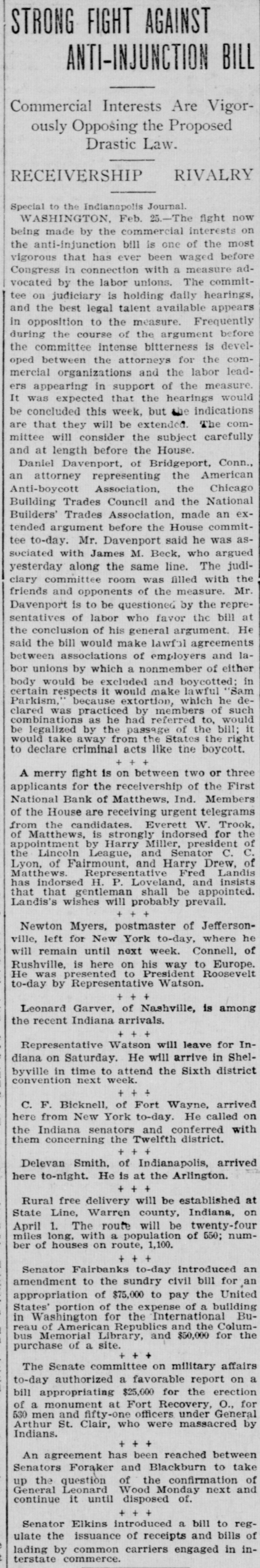 STRONG FIGHT AGAINST ANTI-INJUNCTION BILL Commercial Interests Are Vigorously Opposing the Proposed Drastic Law. RIVALRY RECEIVERSHIP Special to the Indianapolis Journal. WASHINGTON, Feb. 25.-The fight now being made by the commercial interests on the bill is one of the most that has ever been before vigorous anti-injunction waged Congress in connection with a measure advocated by the labor unions. The committee on judiciary is holding daily hearings, talent available and the best legal appears in opposition to the measure. Frequently course of the before the intense develduring committee the bitterness argument is oped between the for the comleadmercial organizations in attorneys and the labor ers appearing support of the measure It was that the would be but indications concluded expected this week, hearings the are will be The comconsider the carefully mittee that will they extended subject and at length before the House. of an the American Daniel attorney Davenport, representing Bridgeport, Conn., the Council and the National Building Anti-boycott Trades Association, Chicago Builders' Trades Association, made exbefore the House commitDavenport said he was astee tended to-day. argument Mr. an sociated with James M. who the same line. The yesterday along Beck, argued judiclary committee room was filled with the of the measure. Mr. friends Davenport and is opponents to be questioned by the reprelabor who at the of his He sentatives conclusion of general favor argument. the bill said the bill would make lawfol agreements between associations of employers and labor unions by which a nonmember of either body would be excluded and boycotted; in certain respects it would make lawful "Sam Parkism, because extortion, which he declared was practiced by members of such as he had referred be combinations legalized to, would by the passage of the bill; it away from the States the right acts like the to would declare take criminal boycott. A merry fight is on between two or three for receivership applicants the of the First National Bank of Matthews, Ind. Members of the House are receiving urgent telegrams from the candidates. Everett W. Trook, of Matthews, is strongly indorsed for the appointment by Harry Miller, president of the Lincoln League, and Senator C. C. Lyon, of Fairmount, and Harry Drew, of Matthews. Representative Fred Landis has indorsed H. P. Loveland, and insists gentleman shall be appointed. Landis's that that wishes will probably prevail. Newton Myers, postmaster of Jeffersonville, left for New York to-day, where he will remain until next week. Connell, of Rushville, is here on his way to Europe. He was presented to President Roosevelt to-day by Representative Watson. + Leonard Garver, of Nashville, is among the recent Indiana arrivals. Representative Watson will leave for Indiana on Saturday. He will arrive in Shelbyville in time to attend the Sixth district convention next week. + C. F. Bicknell, of Fort Wayne, arrived here from New York to-day. He called on the Indiana senators and conferred with them concerning the Twelfth district. Delevan Smith, of Indianapolis, arrived here to-night. He is at the Arlington. + Rural free delivery will be established at State Line, Warren county, Indiana, on April 1. The route will be twenty-four miles long. with a population of 550; number of houses on route, 1,100. Senator Fairbanks to-day introduced an amendment to the sundry civil bill for an appropriation of $75,000 to pay the United States' portion of the expense of a building in Washington for the International Bureau of American Republics and the Columbus Memorial Library, and $50,000 for the purchase of a site. The Senate committee on military affairs to-day authorized a favorable report on a bill appropriating $25,000 for the erection a at Fort men officers under 530 of Arthur monument St. and fifty-one Recovery, General O., for Clair, who were massacred by Indians. An agreement has been reached between Senators Foraker and Blackburn to take up the question of the confirmation of General Leonard Wood Monday next and continue it until disposed of. Senator Elkins introduced a bill to regof and of ulate lading the by issuance receipts bills common carriers engaged in interstate commerce.