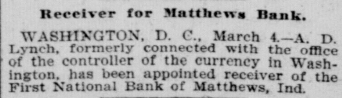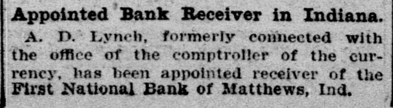 Appointed Bank Receiver in Indiana. A. D. Lynch, formerly connected with the office of the comptroller of the currency, has been appointed receiver of the First National Bank of Matthews, Ind.