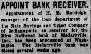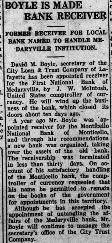 IS MADE BANK RECEIVER FOR TO HANDLE MEBANK NAMED DARYVILLE INSTITUTION. secretary of the David M. Boyle, Trust of Loan & Company been appointed receiver fayette has National Bank for First McIntosh, by United States comptroller of curwill wind up the busirency. He ness of the bank, which closed its doors about ten days ago. Mr. Boyle was year ago for the Monticello pointed receiver Bank Monticello, National through his bank was organized, taking assets of the bank. the receivership terminated less than thirty days. On achis satisfactory handling the Monticello bank, the of requested that troller name be permitted to remain the books the government for appointments in this territory. Although accepted untangling the appointment Medaryville bank, Mr. fairs of Boyle continue to manage the office of the City Trust secretary's Company.