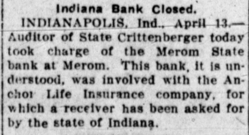 Indiana Bank Closed. INDIANAPOLIS, Ind., April 13.Auditor of State Crittenberger today took charge of the Merom State bank at Merom. This bank, it is understood, was involved with the Anchoi Life Insurance company, for which a receiver has been asked for by the state of Indiana.