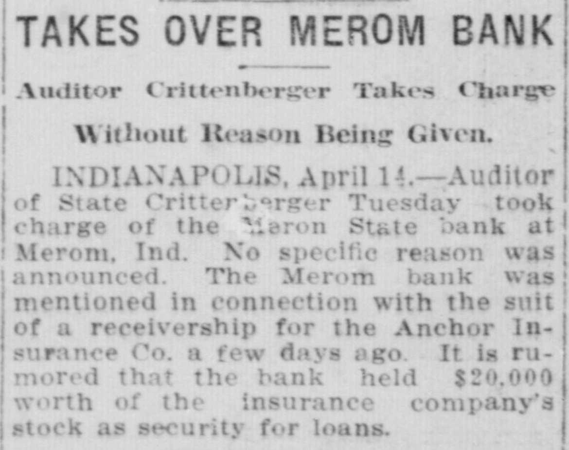 TAKES OVER MEROM BANK Auditor Crittenberger Takes Charge Without Reason Being Given. INDIANAPOLIS, April 14.-Auditor of State Critterberger Tuesday took charge of the Meron State bank at Merom, Ind. No specific reason was announced. The Merom bank was mentioned in connection with the suit of a receivership for the Anchor Insurance Co. a few days ago. It is rumored that the bank held $20,000 worth of the insurance company's stock as security for loans.