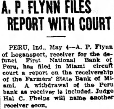 FLYNN FILES REPORT WITH COURT PERU, Ind., May 4-A. P. Flynn of Logansport, receiver for the defunct First National Bank of Peru, has filed in Miami circuit court report on the receivership of the Farmers' State Bank of MI. ami. A withdrawal of the Peru bank as receiver 18 included. Judge Hal C. Phelps will name another