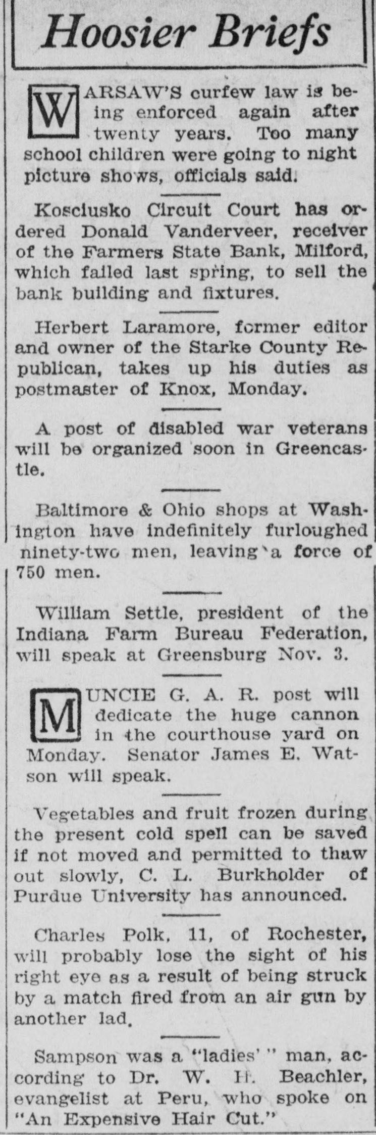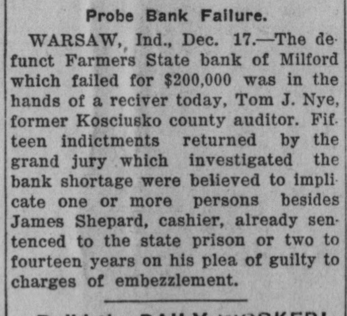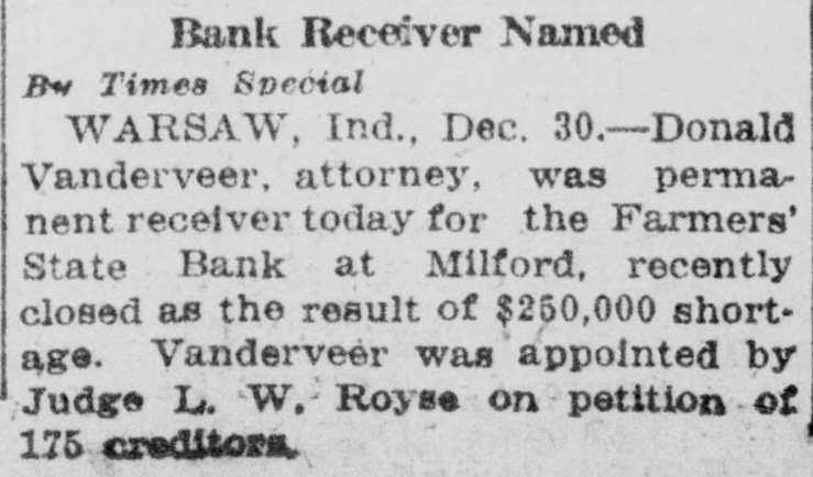 D. S. Vanderveer, receiver of the Farmers' State Bank of Milford, has filed a report with the Warsaw Circuit Court here, showing claims amounting to $322,135.74, and a distribution of 18 per cent or $58,834.58. It is now evident that creditors will receive less than 20 per cent.