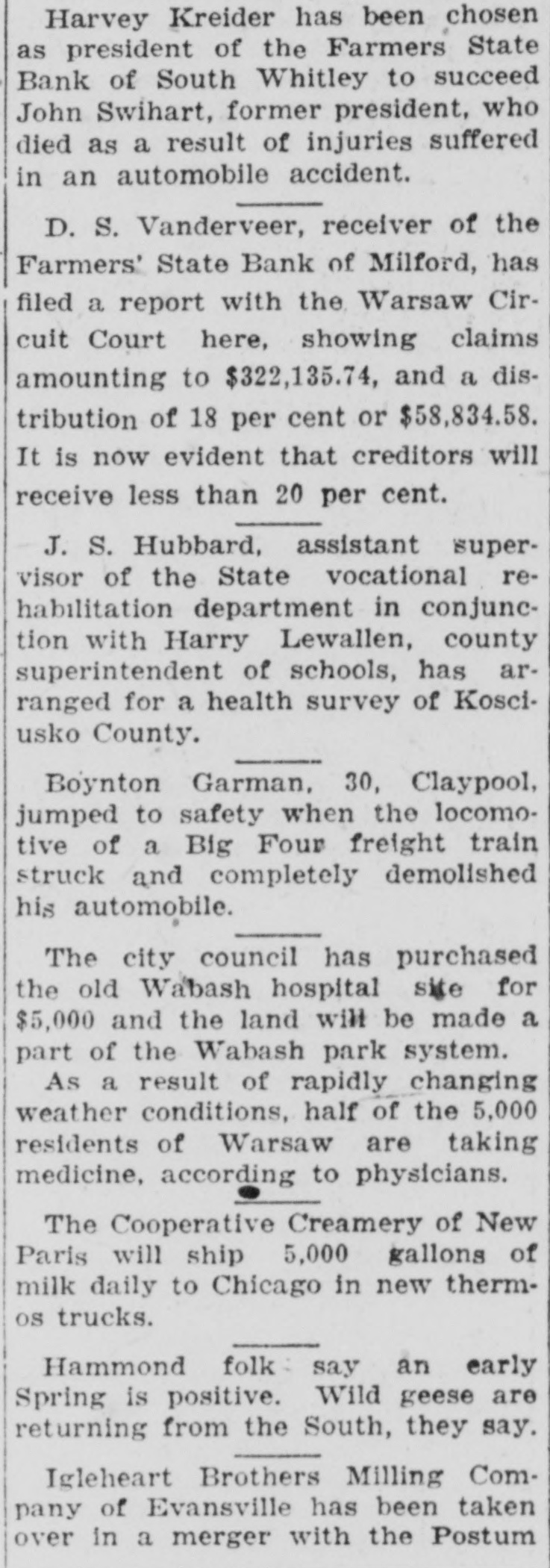J. S. Hubbard, assistant supervisor of the State vocational rehabilitation department in conjunction with Harry Lewallen, county superintendent of schools, has arranged for a health survey of Kosciusko County.