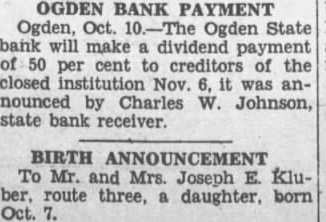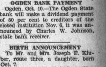 OGDEN BANK PAYMENT Ogden, Oct. Ogden State bank will make dividend payment of 50 cent creditors of the closed Nov. it was announced by Charles W. Johnson, state bank receiver. BIRTH ANNOUNCEMENT To Mr. and Mrs. Joseph Kluber, route three, a daughter, born Oct.