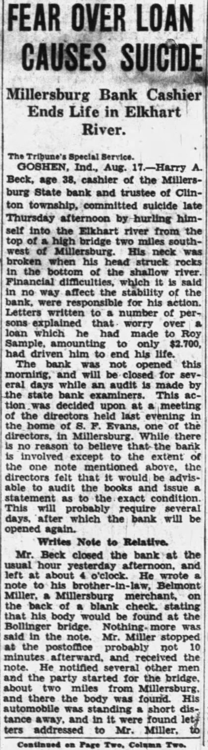 FEAR OVER LOAN CAUSES SUICIDE Millersburg Bank Cashier Ends Life in Elkhart River. Tribune's GOSHEN, Ind., Aug. Beck, age cashier of the Millersburg State bank and trustee of Clinton township, committed suicide late Thursday afternoon by hurling himself into the Elkhart river from the top bridge miles southof His neck broken when his struck rocks the bottom of the shallow river. Financial which it no affect the stability of the bank, for his Letters written number of persons explained that worry loan which he had made Roy Sample, only driven him to end his The bank was opened this morning, and will be closed for eral days while an audit made by the state bank This tion was decided upon at meeting the directors held last evening the home of Evans. one of the directors, While there reason to believe that the bank involved except to the extent the one note mentioned above, the directors felt that would be advisable to audit the books and issue to exact condition. This probably require several days, after which the bank will opened again. Writes Note to Relative. Mr. Beck closed the bank the usual hour yesterday afternoon. and left about He wrote to his Millersburg merchant, the back of blank check. stating that his body would be found at the Bollinger bridge. more was said in note. Mr. Miller stopped the postoffice probably minutes afterward. and received the note. He notified several other and the party started for the about miles from Millersburg. and there the body was found. His automobile was standing short tance away, in it were found ters addressed to Mr. Continued Page Column