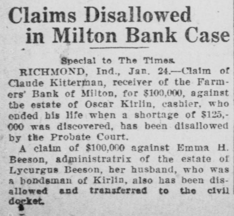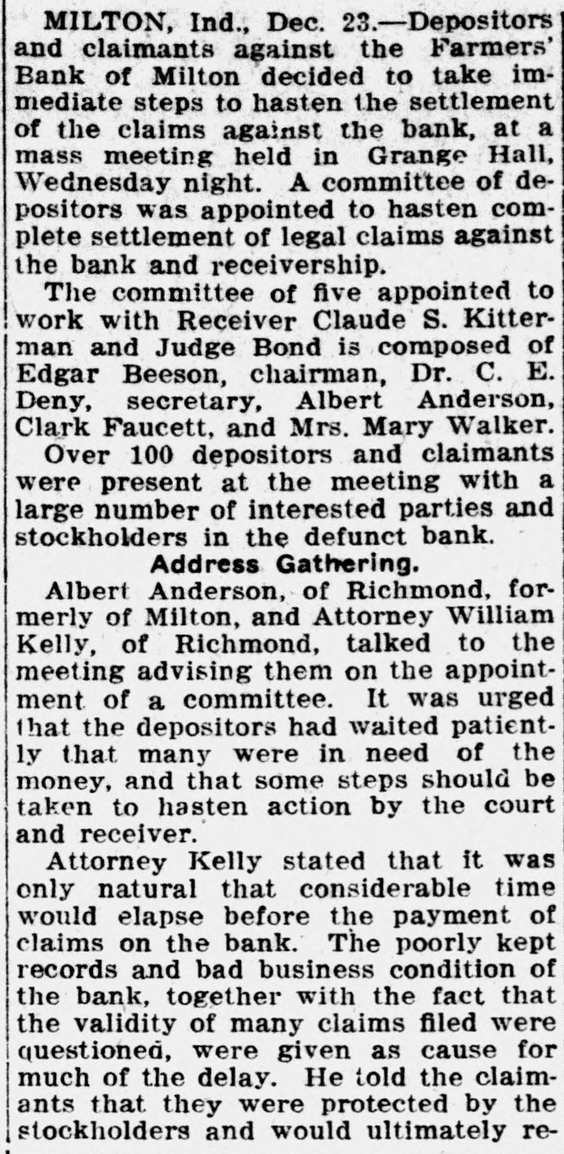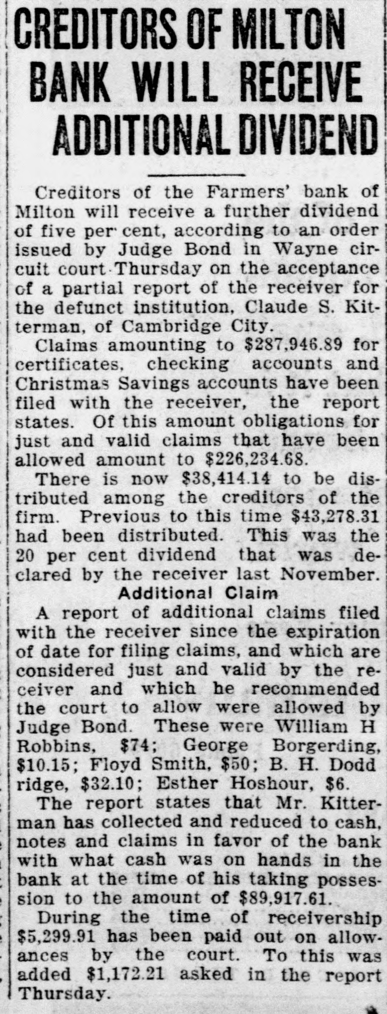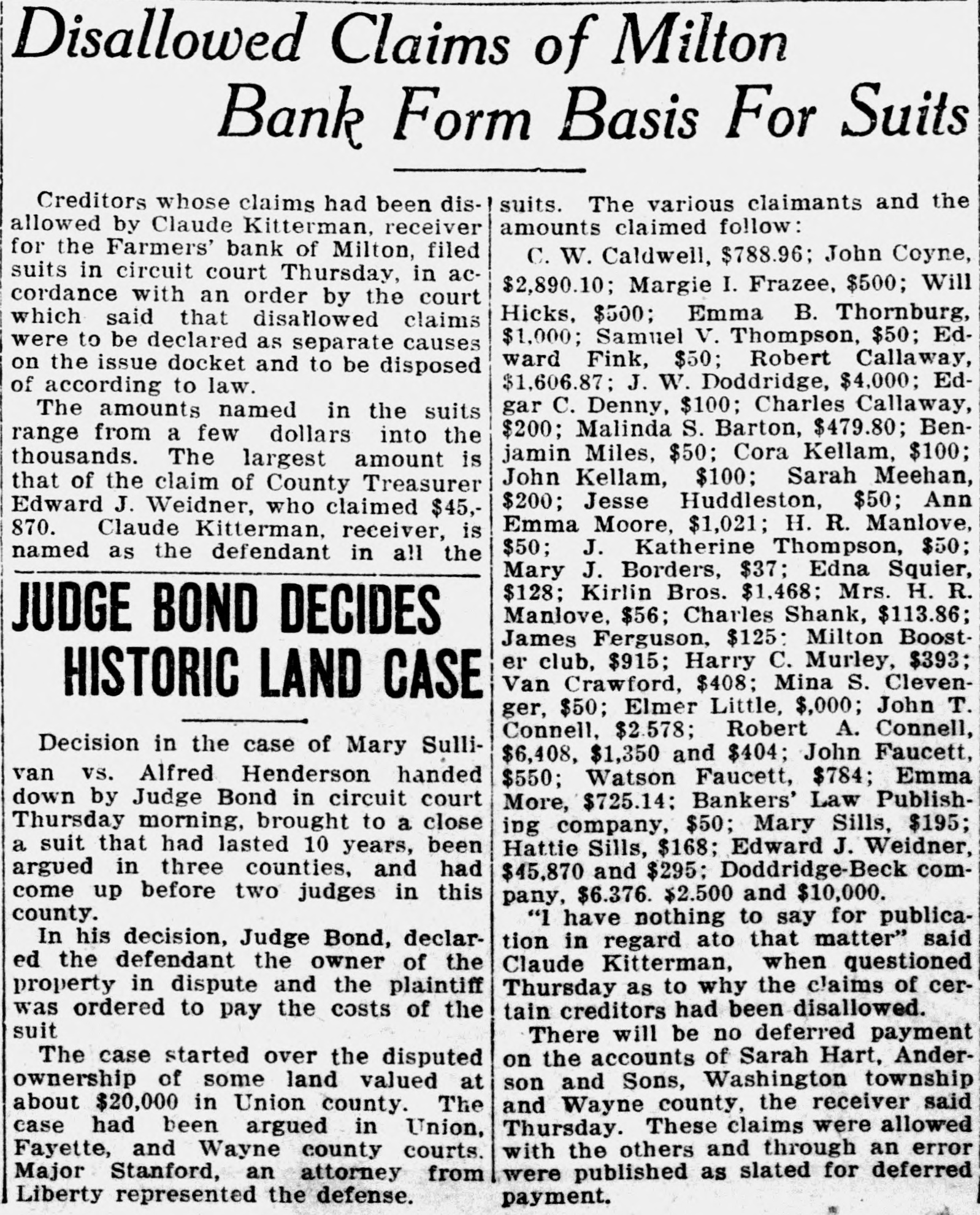 Disallowed Claims of Milton Bank Form Basis For Suits suits. The various claimants and the Creditors whose claims had been disamounts claimed follow: allowed by Claude Kitterman, receiver for the Farmers' bank of Milton, filed C. W. Caldwell, $788.96; John Coyne, suits in circuit court Thursday, in ac$2,890.10; Margie I. Frazee, $500; Will cordance with an order by the court Hicks, $500; Emma B. Thornburg, which said that disallowed claims $1,000; Samuel V. Thompson, $50; Edwere to be declared as separate causes ward Fink, $50; Robert Callaway, on the issue docket and to be disposed $1,606.87; J. W. Doddridge, $4,000; Edof according to law. gar C. Denny, $100; Charles Callaway, The amounts named in the suits $200; Malinda S. Barton, $479.80; Benrange from a few dollars into the jamin Miles, $50; Cora Kellam, $100; thousands. The largest amount is John Kellam, $100; Sarah Meehan, that of the claim of County Treasurer $200; Jesse Huddleston, $50; Ann Edward J. Weidner, who claimed $45,Emma Moore, $1,021; H. R. Manlove, 870. Claude Kitterman, receiver, is $50; J. Katherine Thompson, $50; named as the defendant in all the Mary J. Borders, $37; Edna Squier, $128; Kirlin Bros. $1,468; Mrs. H. R. Manlove, $56; Charles Shank, $113.86; JUDGE BOND DECIDES James Ferguson, $125: Milton Booster club, $915; Harry C. Murley, $393; Van Crawford, $408; Mina S. ClevenHISTORIC LAND CASE ger, $50; Elmer Little, $,000; John T. Connell, $2.578; Robert A. Connell, Decision in the case of Mary Sulli$6,408, $1,350 and $404; John Faucett, van vs. Alfred Henderson handed $550; Watson Faucett, $784; Emma down by Judge Bond in circuit court More, $725.14: Bankers' Law PublishThursday morning, brought to a close ing company, $50; Mary Sills, $195; a suit that had lasted 10 years, been Hattie Sills, $168; Edward J. Weidner, argued in three counties, and had $45,870 and $295; Doddridge-Beck comcome up before two judges in this pany, $6.376. $2.500 and $10,000. county. "I have nothing to say for publicaIn his decision, Judge Bond, declartion in regard ato that matter" said ed the defendant the owner of the Claude Kitterman, when questioned property in dispute and the plaintiff Thursday as to why the claims of certain creditors had been disallowed. was ordered to pay the costs of the suit There will be no deferred payment on the accounts of Sarah Hart, AnderThe case started over the disputed ownership of some land valued at son and Sons, Washington township about $20,000 in Union county. The and Wayne county, the receiver said case had been argued in Union, Thursday. These claims were allowed with the others and through an error Fayette, and Wayne county courts. Major Stanford, an attorney from were published as slated for deferred Liberty represented the defense. payment.