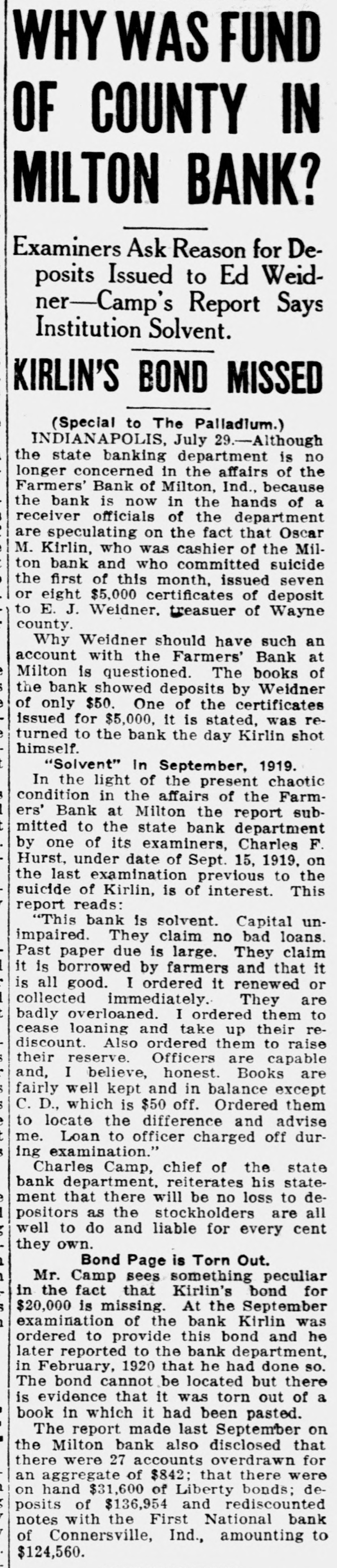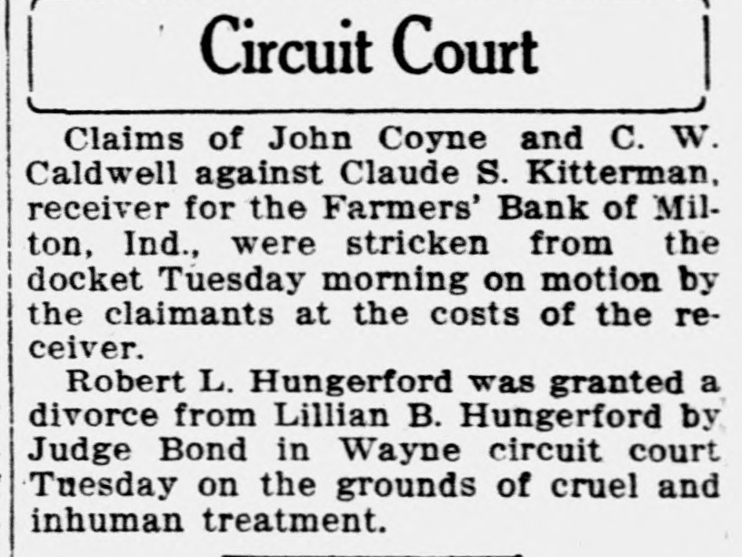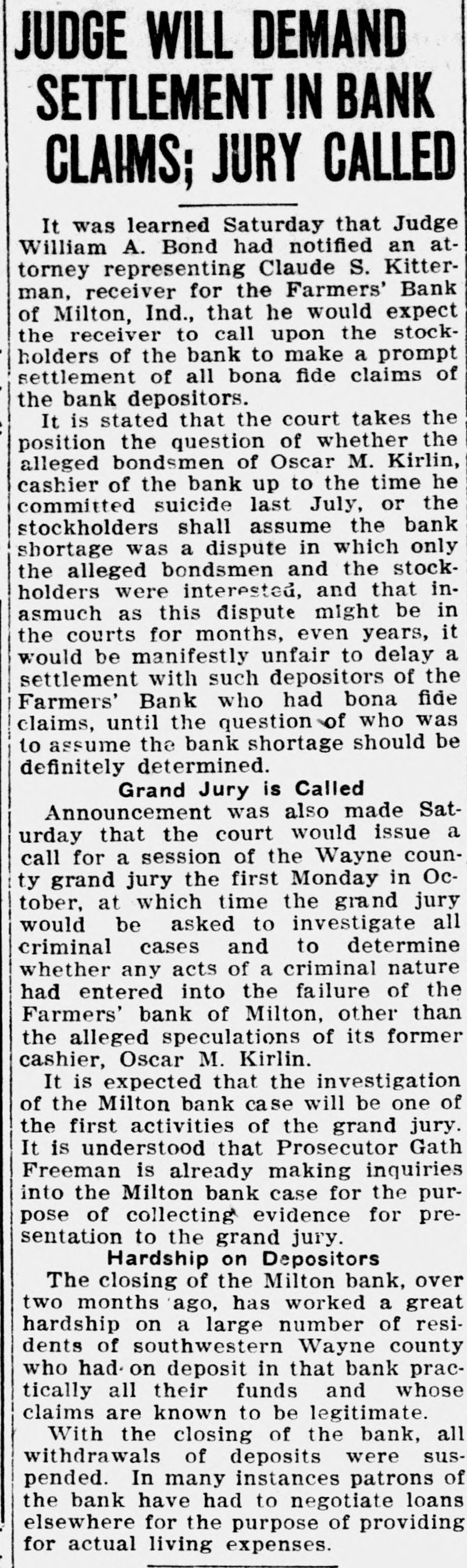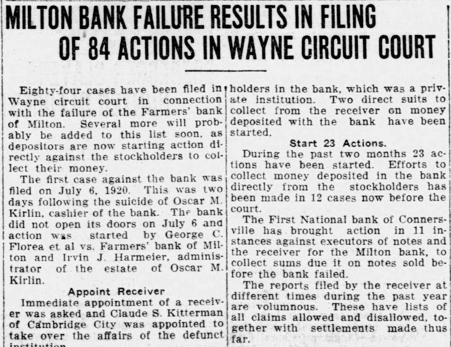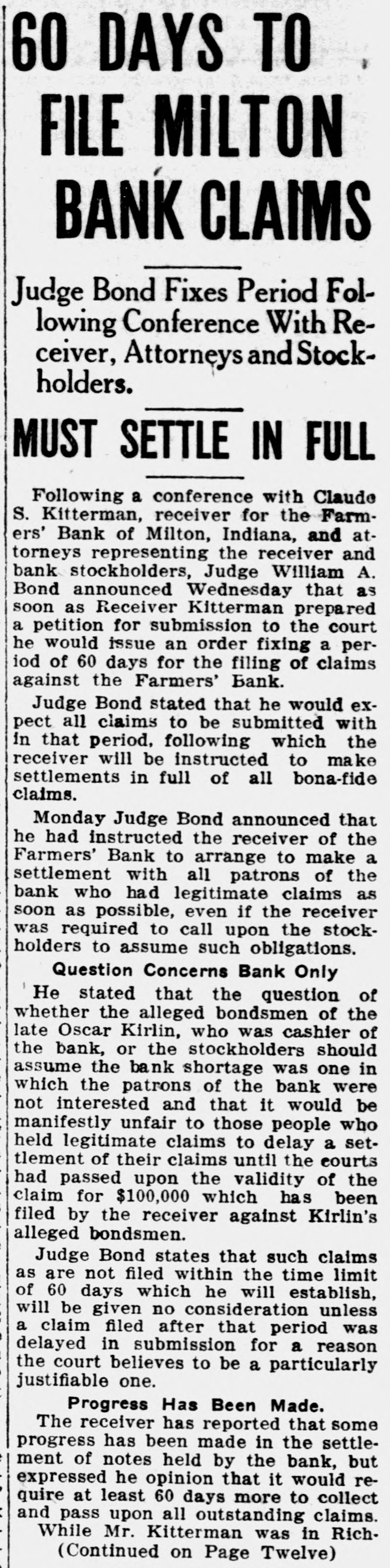 Disallowed Claims of Milton Bank Form Basis For Suits suits. The various claimants and the Creditors whose claims had been disamounts claimed follow: allowed by Claude Kitterman, receiver for the Farmers' bank of Milton, filed C. W. Caldwell, $788.96; John Coyne, suits in circuit court Thursday, in ac$2,890.10; Margie I. Frazee, $500; Will cordance with an order by the court Hicks, $500; Emma B. Thornburg, which said that disallowed claims $1,000; Samuel V. Thompson, $50; Edwere to be declared as separate causes ward Fink, $50; Robert Callaway, on the issue docket and to be disposed $1,606.87; J. W. Doddridge, $4,000; Edof according to law. gar C. Denny, $100; Charles Callaway, The amounts named in the suits $200; Malinda S. Barton, $479.80; Benrange from a few dollars into the jamin Miles, $50; Cora Kellam, $100; thousands. The largest amount is John Kellam, $100; Sarah Meehan, that of the claim of County Treasurer $200; Jesse Huddleston, $50; Ann Edward J. Weidner, who claimed $45,Emma Moore, $1,021; H. R. Manlove, 870. Claude Kitterman, receiver, is $50; J. Katherine Thompson, $50; named as the defendant in all the Mary J. Borders, $37; Edna Squier, $128; Kirlin Bros. $1,468; Mrs. H. R. Manlove, $56; Charles Shank, $113.86; JUDGE BOND DECIDES James Ferguson, $125: Milton Booster club, $915; Harry C. Murley, $393; Van Crawford, $408; Mina S. ClevenHISTORIC LAND CASE ger, $50; Elmer Little, $,000; John T. Connell, $2.578; Robert A. Connell, Decision in the case of Mary Sulli$6,408, $1,350 and $404; John Faucett, van vs. Alfred Henderson handed $550; Watson Faucett, $784; Emma down by Judge Bond in circuit court More, $725.14: Bankers' Law PublishThursday morning, brought to a close ing company, $50; Mary Sills, $195; a suit that had lasted 10 years, been Hattie Sills, $168; Edward J. Weidner, argued in three counties, and had $45,870 and $295; Doddridge-Beck comcome up before two judges in this pany, $6.376. $2.500 and $10,000. county. "I have nothing to say for publicaIn his decision, Judge Bond, declartion in regard ato that matter" said ed the defendant the owner of the Claude Kitterman, when questioned property in dispute and the plaintiff Thursday as to why the claims of certain creditors had been disallowed. was ordered to pay the costs of the suit There will be no deferred payment on the accounts of Sarah Hart, AnderThe case started over the disputed ownership of some land valued at son and Sons, Washington township about $20,000 in Union county. The and Wayne county, the receiver said case had been argued in Union, Thursday. These claims were allowed with the others and through an error Fayette, and Wayne county courts. Major Stanford, an attorney from were published as slated for deferred Liberty represented the defense. payment.