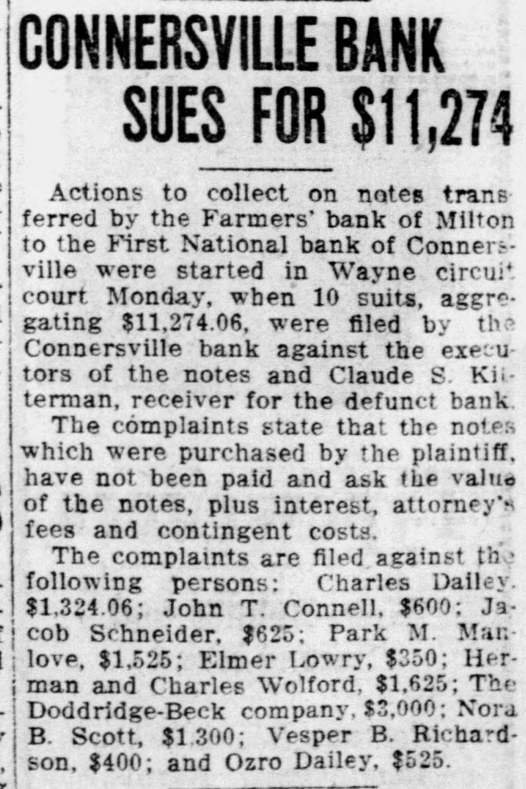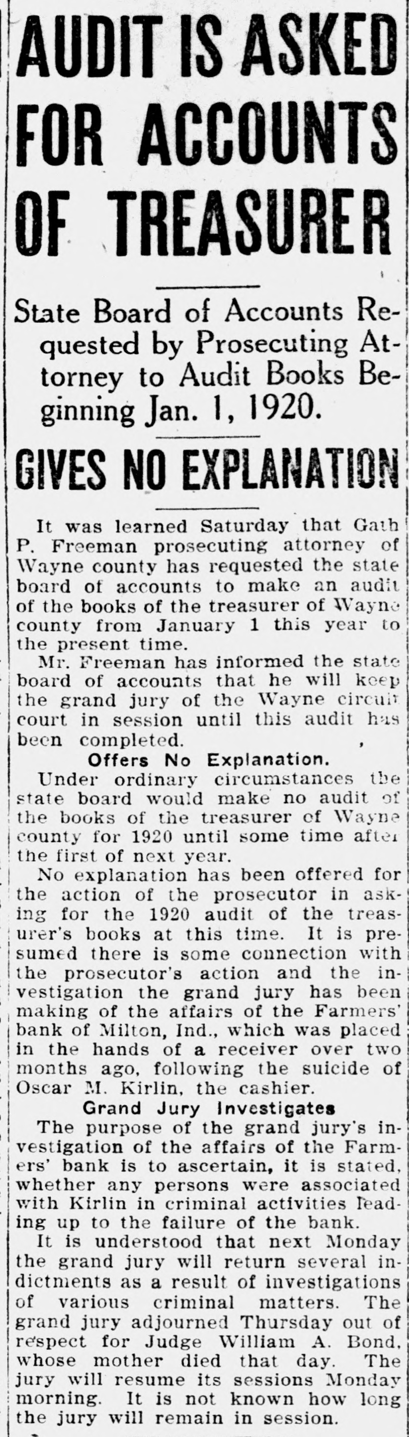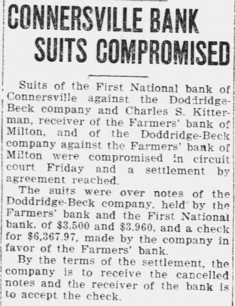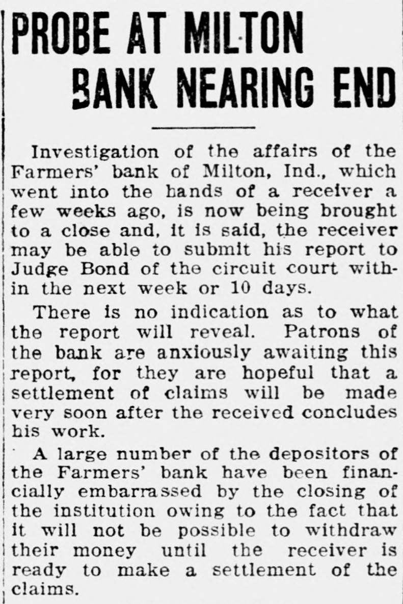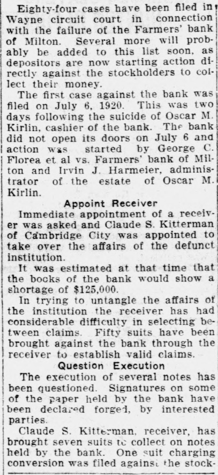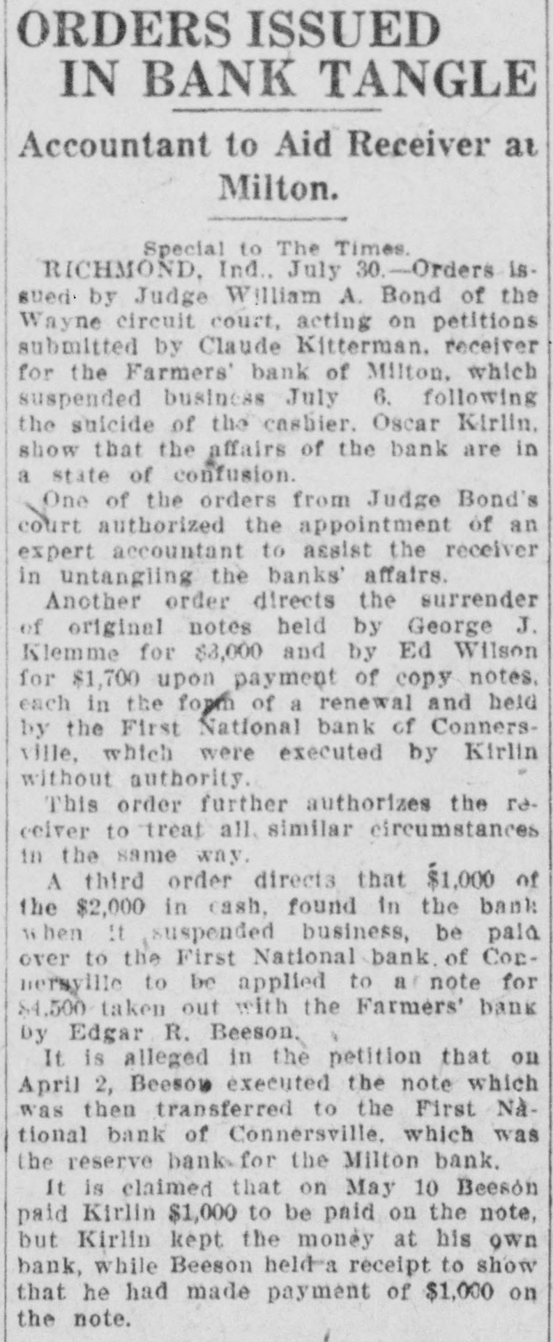 ORDERS ISSUED IN BANK TANGLE Accountant to Aid Receiver at Milton. Special to The Times. RICHMOND. Ind., July 30. Orders is. sued by Judge William A. Bond of the Wayne circuit court, acting on petitions submitted by Claude Kitterman. receiver for the Farmers' bank of Milton, which suspended business July 6. following the suicide of the cashier. Oscar Kirlin, show that the affairs of the bank are in a state of confusion. One of the orders from Judge Bond's court authorized the appointment of an expert accountant to assist the receiver in untangling the banks' affairs. Another order directs the surrender of original notes held by George J. Klemme for $3,000 and by Ed Wilson for $1,700 upon payment of copy notes. each in the form of a renewal and held by the First National bank of Connersville, which were executed by Kirlin without authority. This order further authorizes the receiver to treat all. similar circumstances in the same way. A third order directs that $1,000 of the $2,000 in cash, found in the bank when It suspended business, be paid over to the First National bank. of Cornersville to be applied to note for $4,500 taken out with the Farmers' bank Dy Edgar R. Beeson It is alleged in the petition that on April 2, Beeson executed the note which was then transferred to the First National bank of Connersville. which was the reserve banks for the Milton bank. It is claimed that on May 10 Beeson paid Kirlin $1,000 to be paid on the note, but Kirlin kept the monêy at his own bank, while Beeson held a receipt to show that he had made payment of $1,000 on the note.