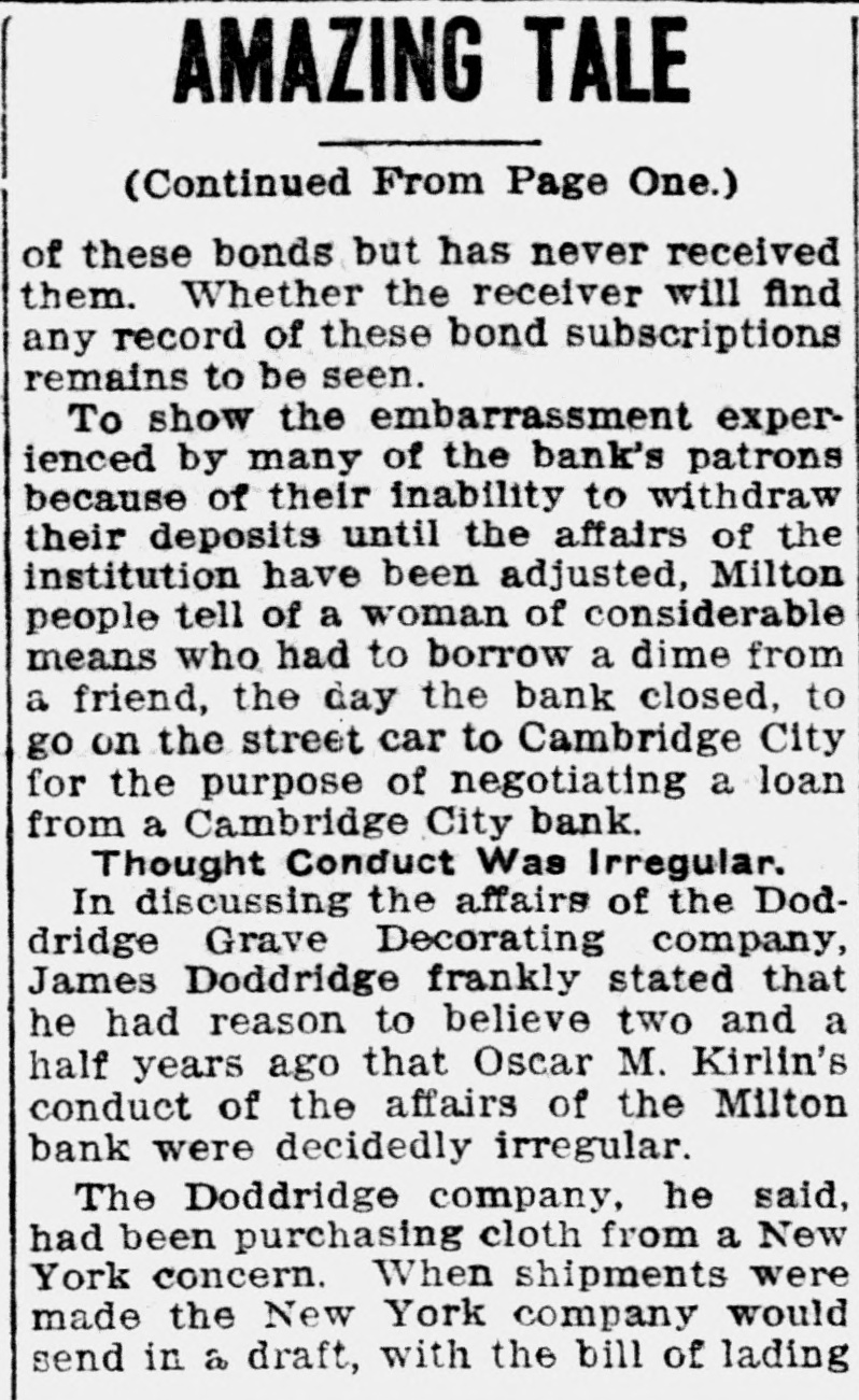 # AMAZING TALE (Continued From Page One.) of these bonds but has never received them. Whether the receiver will find any record of these bond subscriptions remains to be seen. To show the embarrassment experienced by many of the bank's patrons because of their inability to withdraw their deposits until the affairs of the institution have been adjusted, Milton people tell of a woman of considerable means who had to borrow a dime from a friend, the day the bank closed, to go on the street car to Cambridge City for the purpose of negotiating a loan from a Cambridge City bank. Thought Conduct Was Irregular. In discussing the affairs of the Doddridge Grave Decorating company, James Doddridge frankly stated that he had reason to believe two and a half years ago that Oscar M. Kirlin's conduct of the affairs of the Milton bank were decidedly irregular. The Doddridge company, he said, had been purchasing cloth from a New York concern. When shipments were made the New York company would send in a draft, with the bill of lading.