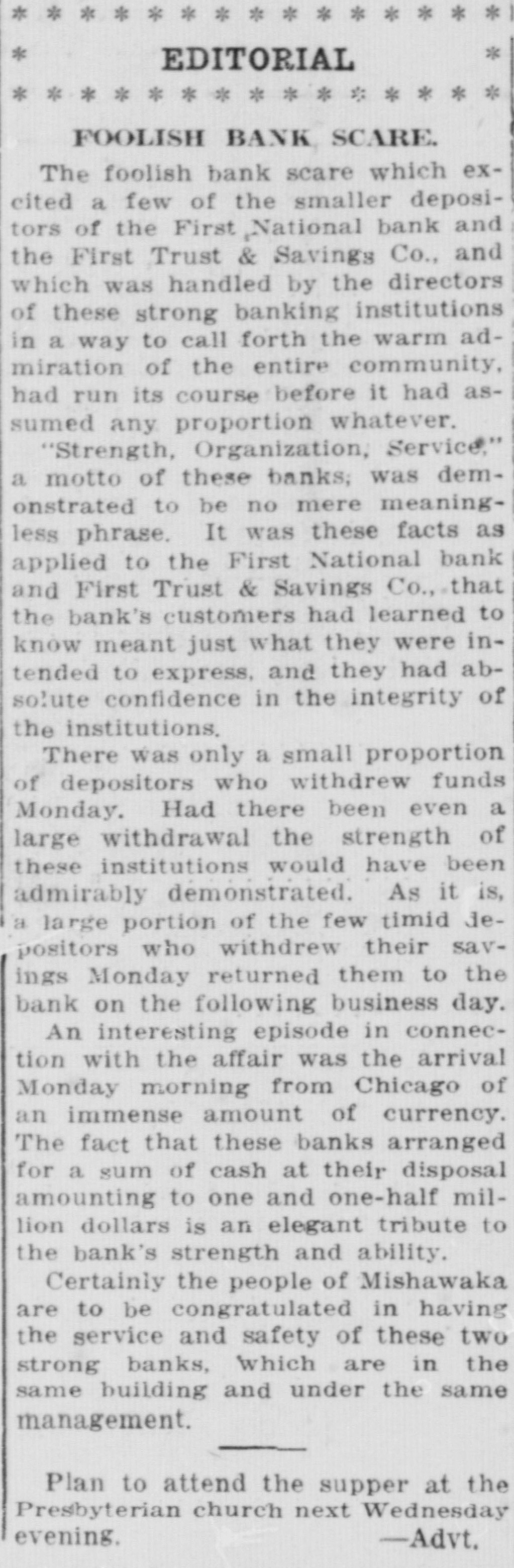 EDITORIAL FOOLISH BANK SCARE. The foolish bank scare which excited a few of the smaller depositors of the First National bank and the First Trust & Savings Co., and which was handled by the directors of these strong banking institutions in a way to call forth the warm admiration of the entire community, had run its course before it had assumed any proportion whatever. "Strength, Organization, Service," a motto of these banks; was demonstrated to be no mere meaningless phrase. It was these facts as applied to the First National bank and First Trust & Savings Co., that the bank's customers had learned to know meant just what they were intended to express, and they had absolute confidence in the integrity of the institutions. There was only a small proportion of depositors who withdrew funds Monday. Had there been even a large withdrawal the strength of these institutions would have been admirably demonstrated. As it is, a large portion of the few timid depositors who withdrew their savings Monday returned them to the bank on the following business day. An interesting episode in connection with the affair was the arrival Monday morning from Chicago of an immense amount of currency. The fact that these banks arranged for a sum of cash at their disposal amounting to one and one-half million dollars is an elegant tribute to the bank's strength and ability. Certainly the people of Mishawaka are to be congratulated in having the service and safety of these two strong banks, which are in the same building and under the same management. Plan to attend the supper at the Presbyterian church next Wednesday evening. -Advt.