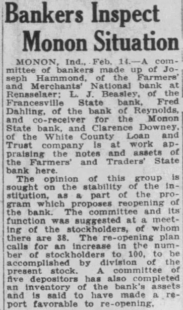 Bankers Inspect Monon Situation MONON, Ind., Feb. committee of made up Joseph Hammond, of the Farmers' and Merchants' National bank Rensselaer: L. J. Beasley, of the Francesville State bank, Fred Dahling. of the bank of Reynolds, and co-receiver for the Monon State bank, and Clarence Downey, of the White County Loan and Trust company at work appraising the notes and assets of the Farmers' and Traders' State bank here. The opinion of this group is sought on the stability of the institution, as a part of the gram which proposes of the bank. The commit and its function was suggested at meeting of the stockholders, of whom there are 38. The re-opening plan calls for an increase in the number of stockholders to 100, to be accomplished division of the present stock. five depositors has completed an inventory of the bank's assets and is said to have made a report favorable to re-opening