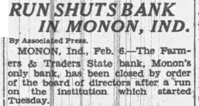 IN MONON, IND. By Associated Press. Ind., Feb. Farmers & Traders State bank, Monon's only has been closed by order of the after run on the institution which started