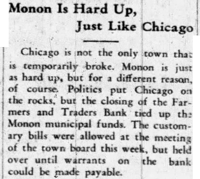 Monon Is Hard Up, Just Like Chicago Chicago is not the only town that is temporarily broke. Monon is just as hard up, but for a different reason, of course. Politics put Chicago on the rocks, but the closing of the Farmers and Traders Bank tied up the Monon municipal funds. The customary bills were allowed at the meeting of the town board this week, but held over until warrants on the bank could be made payable.