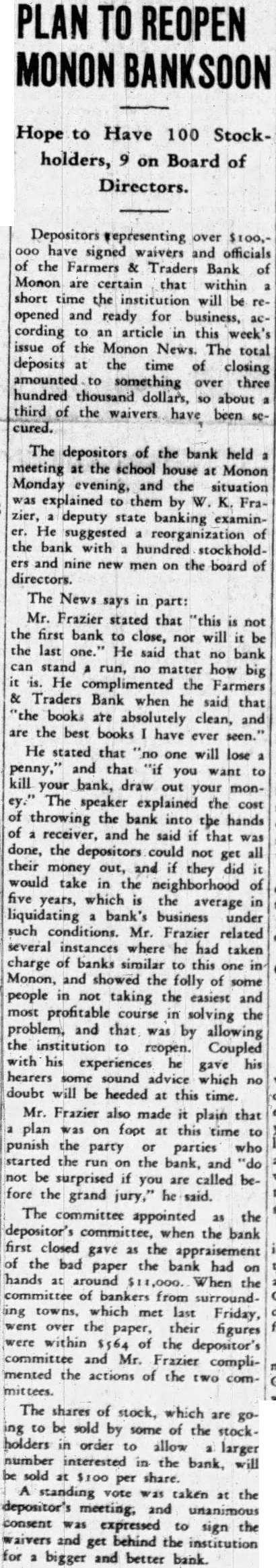 PLAN TO REOPEN MONON BANKSOON Hope to Have 100 Stockholders, 9 on Board of Directors. Depositors representing over $100,000 have signed waivers and officials of the Farmers & Traders Bank of Monon are certain that within a short time the institution will be reopened and ready for business, according to an article in this week's issue of the Monon News. The total deposits at the time of closing amounted to something over three hundred thousand dollars, so about a third of the waivers have been secured. The depositors of the bank held a meeting at the school house at Monon Monday evening, and the situation was explained to them by W. K. Frazier, deputy state banking examiner. He suggested a reorganization of the bank with a hundred stockhold. ers and nine new men on the board of directors. The News says in part: Mr. Frazier stated that "this is not the first bank to close, nor will it be the last one." He said that no bank can stand a run, no matter how big it is. He complimented the Farmers & Traders Bank when he said that "the books are absolutely clean, and are the best books I have ever seen." He stated that "no one will lose a penny," and that "if you want to kill your bank, draw out your money." The speaker explained the cost of throwing the bank into the hands of a receiver, and he said if that was done, the depositors could not get all their money out, and if they did it would take in the neighborhood of five years, which is the average in liquidating a bank's business under such conditions. Mr. Frazier related several instances where he had taken charge of banks similar to this one in Monon, and showed the folly of some people in not taking the easiest and most profitable course in solving the problem, and that was by allowing the institution to reopen. Coupled with his experiences he gave his hearers some sound advice which no doubt will be heeded at this time. Mr. Frazier also made it plain that a plan was on fopt at this time to punish the party or parties who started the run on the bank, and "do not be surprised if you are called before the grand jury," he said. The committee appointed as the depositor's committee, when the bank first closed gave as the appraisement of the bad paper the bank had on hands at around $11,000. When the committee of bankers from surrounding towns, which met last Friday, went over the paper, their figures were within $564 of the depositor's committee and Mr. Frazier complimented the actions of the two committees. The shares of stock, which are going to be sold by some of the stockholders in order to allow larger number interested in the bank, will be sold at $100 per share. A standing vote was taken at the depositor's meeting, and unanimous consent was expressed to sign the waivers and get behind the institution for a bigger and better bank.