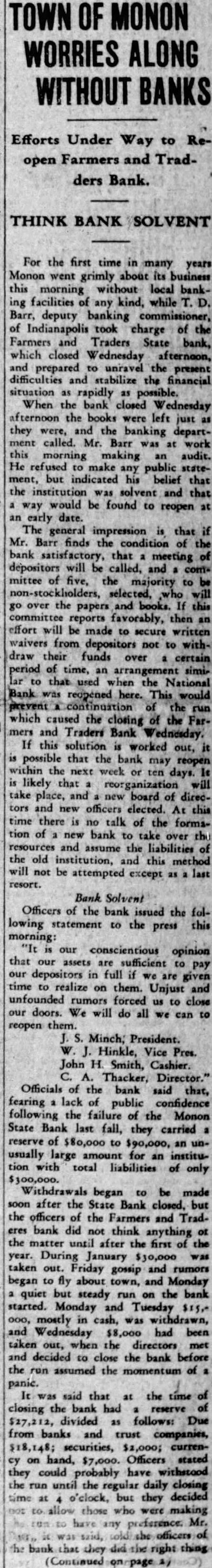 TOWN OF MONON WORRIES ALONG WITHOUT BANKS Efforts Under Way to Reopen Farmers and Tradders Bank. THINK BANK SOLVENT For the first time in many years Monon went grimly about its business this morning without local banking facilities of any kind, while T. D. Barr, deputy banking commissioner, of Indianapolis took charge of the Farmers and Traders State bank, which closed Wednesday afternoon, and prepared to unravel the present difficulties and stabilize the financial situation as rapidly as possible. When the bank closed Wednesday afternoon the books were left just as they were, and the banking department called. Mr. Barr was at work this morning making an audit. He refused to make any public statement, but indicated his belief that the institution was solvent and that a way would be found to reopen at an early date. The general impression is that if Mr. Barr finds the condition of the bank satisfactory, that a meeting of depositors will be called, and a committee of five, the majority to be non-stockholders, selected, who will go over the papers and books. If this committee reports favorably, then an effort will be made to secure written waivers from depositors not to withdraw their funds over a certain period of time, an arrangement simiar to that used when the National Bank was reagened here. This would prevent continuation of the run which caused the closing of the Farmers and Traders Bank Wednesday. If this solution is worked out, it is possible that the bank may reopen within the next week or ten days. It is likely that a reorganization will take place, and a new board of directors and new officers elected. At this time there is no talk of the formation of a new bank to take over the resources and assume the liabilities of the old institution, and this method will not be attempted except as a last resort. Bank Solvent Officers of the bank issued the following statement to the press this morning: "It is our conscientious opinion that our assets are sufficient to pay our depositors in full if we are given time to realize on them. Unjust and unfounded rumors forced us to close our doors. We will do all we can to reopen them. J. S. Minch; President. W. J. Hinkle, Vice Pres. John H. Smith, Cashier. C. A. Thacker, Director." Officials of the bank said that, fearing lack of public confidence following the failure of the Monon State Bank last fall, they carried a reserve of $80,000 to $90,000, an unusually large amount for an institution with total liabilities of only $300,000. Withdrawals began to be made soon after the State Bank closed, but the officers of the Farmers and Traderes bank did not think anything of the matter until after the first of the year. During January $30,000 was taken out. Friday gossip and rumors began to fly about town, and Monday a quiet but steady run on the bank started. Monday and Tuesday $15,000, mostly in cash, was withdrawn, and Wednesday $8,000 had been taken out, when the directors met and decided to close the bank before the run assumed the momentum of a panic. It was said that at the time of closing the bank had a reserve of $27,212, divided as follows: Due from banks and trust companies, $18,148; securities, $2,000; currency on hand, $7,000. Officers stated they could probably have withstood the run until the regular daily closing time at 4 o'clock, but they decided allow those who were making to have any preference. Mr. was said, the officers of the bank that they did the right thing (Continued