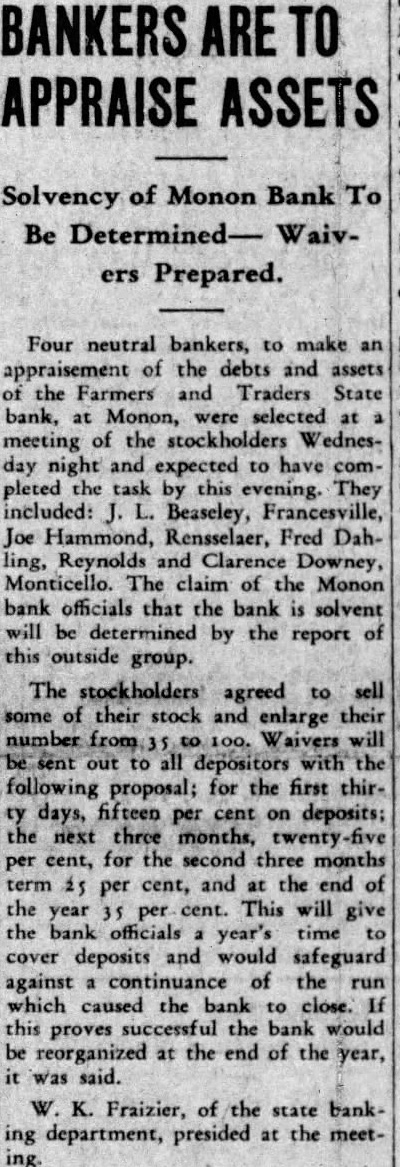 BANKERS ARE TO APPRAISE ASSETS Solvency of Monon Bank To Be Determined— Waivers Prepared. Four neutral bankers, to make an appraisement of the debts and assets of the Farmers and Traders State bank, at Monon, were selected at a meeting of the stockholders Wednesday night and expected to have completed the task by this evening. They included: J. L. Beaseley, Francesville, Joe Hammond, Rensselaer, Fred Dahling, Reynolds and Clarence Downey, Monticello. The claim of the Monon bank officials that the bank is solvent will be determined by the report of this outside group. The stockholders agreed to sell some of their stock and enlarge their number from Waivers will be sent out to all depositors with the following proposal; for the first thirty days, fifteen per cent on deposits; the next three months, twenty -five per cent, for the second three months term 25 per cent, and at the end of the year 35 per cent. This will give the bank officials a year's time to cover deposits and would safeguard against a continuance of the run which caused the bank to close. If this proves successful the bank would be reorganized at the end of the year, it was said. W. K. Fraizier, of the state banking department, presided at the meeting.