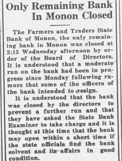 Only Remaining Bank Monon Closed In The Farmers and Traders State Bank of Monon, the only remainbank in Monon was ing afternoon by Wednesday Board of Directors. der of the understood that moderate run the bank had been prosince Monday following of the officers of that some the bank intended resign. It understood that the bank the directors to closed by and that further prevent the State Bank have asked they and is Examiner take charge time that the bank thought this short time if within open the state officials find the bank solvent and in good condition.