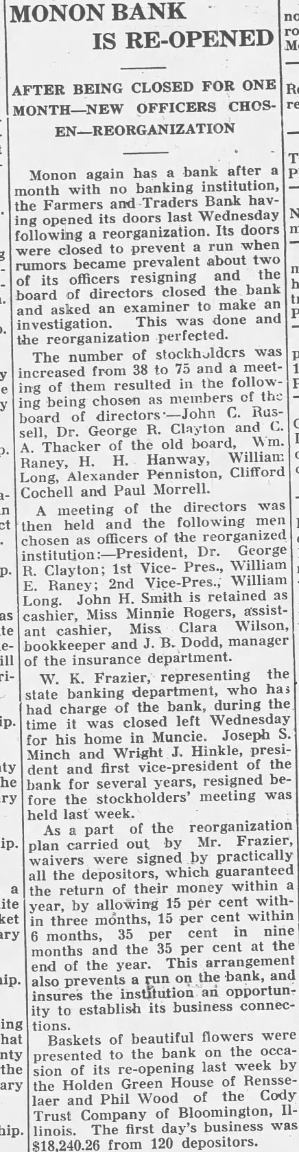MONON BANK IS RE-OPENED AFTER BEING CLOSED FOR ONE OFFICERS CHOSMONTH-NEW EN-REORGANIZATION Monon again has a bank after a month with no banking institution, the Farmers and Traders Bank having opened its doors last Wednesday following reorganization. Its doors were closed to prevent run when rumors became prevalent about two of its officers resigning and the board of directors closed the bank and asked an examiner to make an investigation. This done and the reorganization perfected. The number of stockholders was increased from 38 to 75 and meeting of them resulted in the following being chosen as members of the board directors C. Russell, Dr. George Clayton and C. A. Thacker of the old board, Wm. Raney, H. H. Hanway, William: Long, Alexander Penniston, Clifford Cochell and Paul Morrell. A meeting of the directors was then held and the following men chosen as officers of the reorganized George R. Clayton; 1st Vice- Pres., William E. Raney 2nd Vice-Pres., William Long. John H. Smith is retained as cashier, Miss Minnie Rogers, assistant cashier, Miss Clara Wilson, bookkeeper and J. B. Dodd, manager of the insurance department. W. K. Frazier, representing the state banking department, who has had charge of the bank, during the time it was closed left Wednesday for his home in Muncie. Joseph S. Minch and Wright J. Hinkle, president and first vice-president of the bank for several years, resigned before the stockholders' meeting was held last week. As part of the reorganization plan carried out by Mr. Frazier, were signed by practically all the depositors, which guaranteed the return of their money within year, by allowing 15 per cent within three months, 15 per cent within months, 35 per cent in nine months and the 35 per cent at the end of the year. This arrangement also run the bank, and insures the institution an opportunity to establish its business connections. Baskets of beautiful flowers were presented bank on the occasion its re-opening last week by the Holden Green House of Rensselaer and Phil Wood of the Cody Trust Company of Bloomington, Illinois. The first day's business was $18,240.26 from 120 depositors.