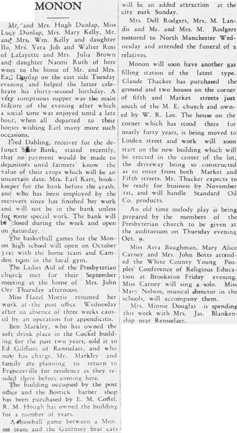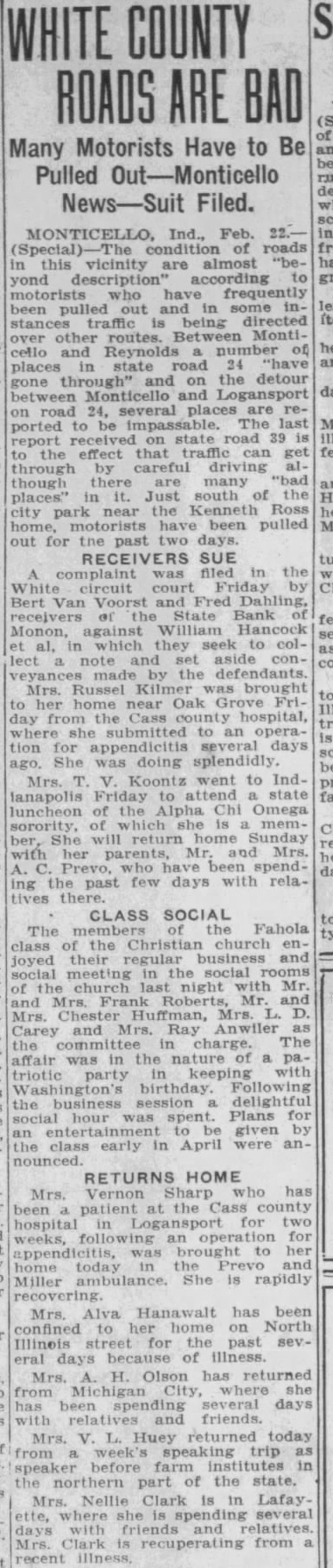 WHITE COUNTY ROADS ARE BAD Many Motorists Have to Be Pulled Out-Monticello News-Suit Filed. MONTICELLO, Ind., Feb. condition of roads in this vicinity are almost "beyond description" according to motorists who have frequently been pulled out and in some stances traffic is being directed over other routes. Between Monticello and Reynolds of state road 24 gone through" and on the detour between Monticello and Logansport on road 24, several places are to be The last ported received on state road 39 report to the effect that traffic get through by careful driving though there many bad places" Just south of the city park near the Kenneth Ross have been pulled out for past days. RECEIVERS SUE A filed in the White circuit court Friday by Bert Van Voorst and Fred Dahling, receivers the State Bank Monon, against William Hancock et al, in which they to collect a note and set aside made the defendants. Mrs. Russel Kilmer was brought to her home near Oak day from the Cass hospital, where submitted to an operation for appendicitis several days ago She was doing splendidly. Mrs. T. V. Koontz went to Indlanapolis Friday to attend state luncheon of the Alpha Chi Omega sorority, of which she is memShe will return home Sunday with her parents, Mr. and Mrs. A. Prevo, who been spending the past few days with relatives CLASS SOCIAL The the Fahola class of the Christian church enjoyed their regular business and social meeting in the social rooms of the church last night with Mr. and Mrs. Frank Roberts, Mr. and Mrs. Huffman, Mrs. D. Carey and Ray Anwiler as the committee in charge. The affair was in the nature of a patriotic party keeping with the business session delightful social hour was spent Plans for an entertainment to be given by the class early in April were an- RETURNS HOME Mrs. Vernon Sharp who has been patient at the Cass county hospital Logansport for two weeks, an operation for appendicitis, brought to her home today in the Miller ambulance. She is rapidly Mrs. Alva Hanawalt has been confined to her home on North Illinois street for the past sevdays because of illness. Mrs. H. Olson has returned from Michigan where she has been spending several days relatives and friends. Mrs. V. L. Huey returned today from week's speaking trip as speaker before farm institutes in the northern part of the state. Mrs. Nellie Clark is in Lafayette, where is spending several days with friends and relatives. Mrs. Clark is recuperating from recent illness,
