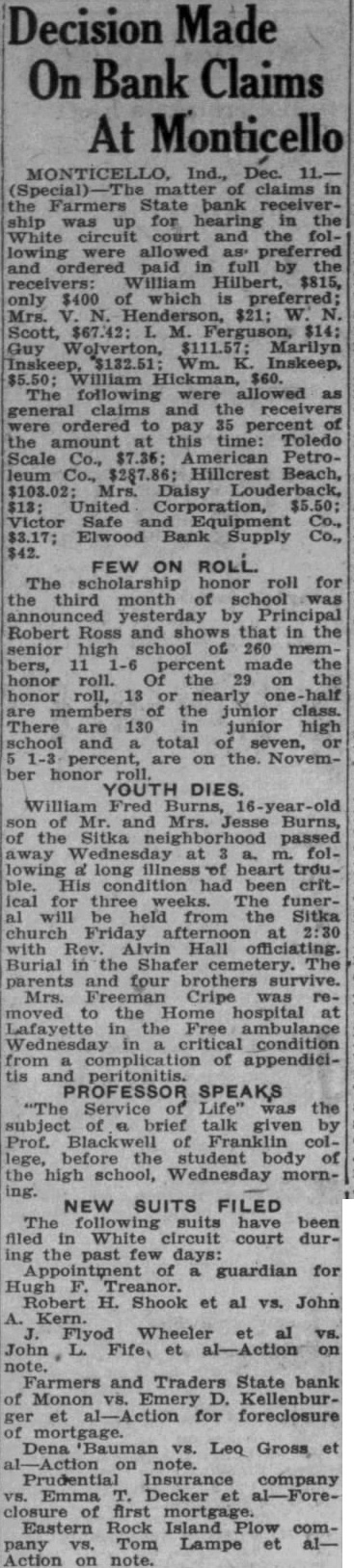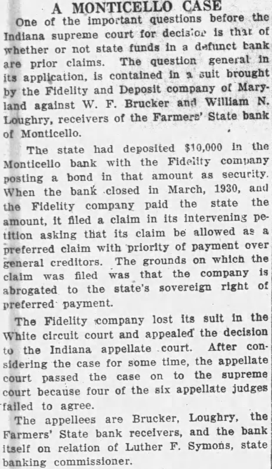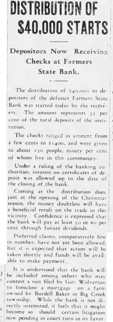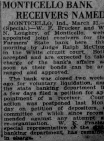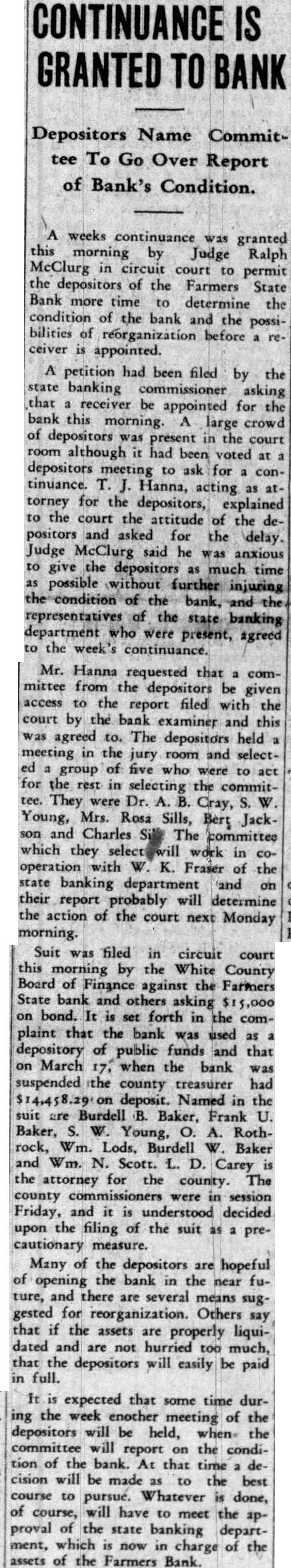 DEPOSITORS ASK DELAY IN NAMING BANK RECEIVER Seek Sufficient Time To Study Prospects of Reorganization. 150 ATTEND MEETING. A petition praying the White circuit court to hold in abeyance the appointment of a receiver for the Farmers State Bank for a time while the depositors considered the advisability of perfecting a reórgenization was signed by a large number of depositors of the bank, who held meeting in the basement of the library Friday evening. If it becomes necessary to appoint receiver, the petition continued, then the depositors would like to have a voice in selecting the person to be designated. T. J. Hanna, local attorney, a depositor and stockholder in the bank, acted as temporary chairman of the meeting by request. Dr. A. B. Cray was selected permanent chairman, and John A. Rothrock secretary. Captain William Guthrie made talk, in which he urged the depositors to stand together for the benefit of all. He said that he was not familiar with the details of the bank, and had no immediate solution to offer for the problem, but suggested that the proper course was for the depositors to study the situation carefully, and work out the plan which would be best both for themselves and the community at large. Charles Johnson said be would like to hear a report on the condition of the bank. Hanna replied that Mr. Fraser, the deputy state bank commissioner in charge of the local institution, completed his report Friday and had forwarded it to the department at Indianapolis. As soon as it had been checked over and o. k.ed there, Mr. Hanna stated, it would be available for public inspection, and he suggested that another meeting be held next week when Mr. Fraser could appear before the depositors and tell them what he knew regarding the bank's condition. Petition Presented At this point the petition was presented and read. Sam Young, formerly receiver for the National Bank. suggested that a definite time be set for the postponement of action by the court. He said that too much delay might give some one a chance to "get out from under.' After considerable discussion, a period of days was decided upon, which would bring the matter up for definite action by the court on March 3 1st. By that time, it is thought that the desirability and practicability of reorganization can be canvassed. Dr. Cray, in speaking at the meeting, pointed out that the interests of the depositors were identical. All of them, he said, were interested in getting 100 cents on every dollar they had put in the bank, if there was any way to work out the problem. He thought that a quick liquidation of the assets might result in material loses. His talk appeared to be well received. None of the officers of the bank attended the meeting, which was more or less in the nature of a preliminary to the business which is expected to come later. A committee probably will be appointed by the depositors to represent them in the future, and the probabilities are that another meeting will be held early next week, at which time Mr. Fraser will make a report. The interest of the depositors is indicated by the fact that 150 out of about 250 depositors of the bank were present last evening.
