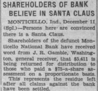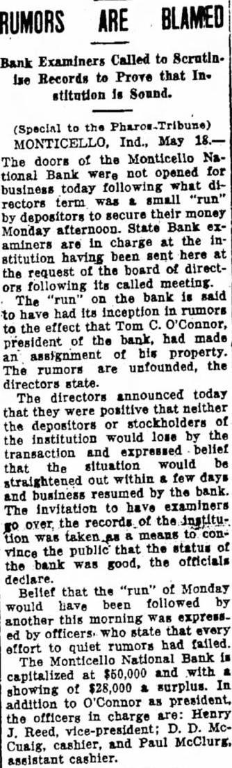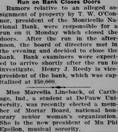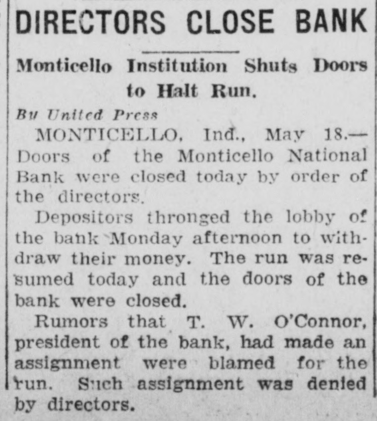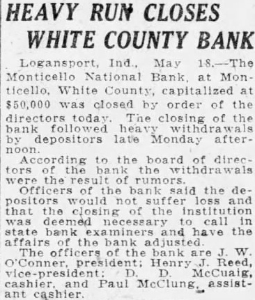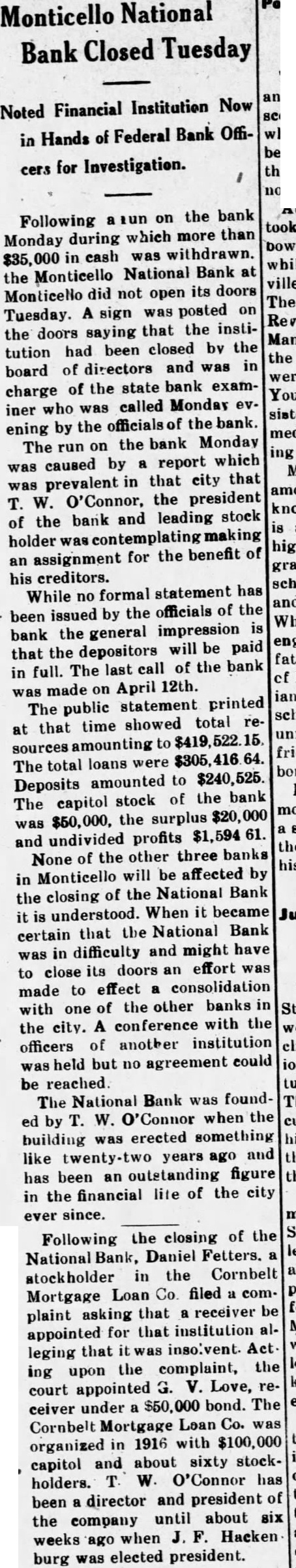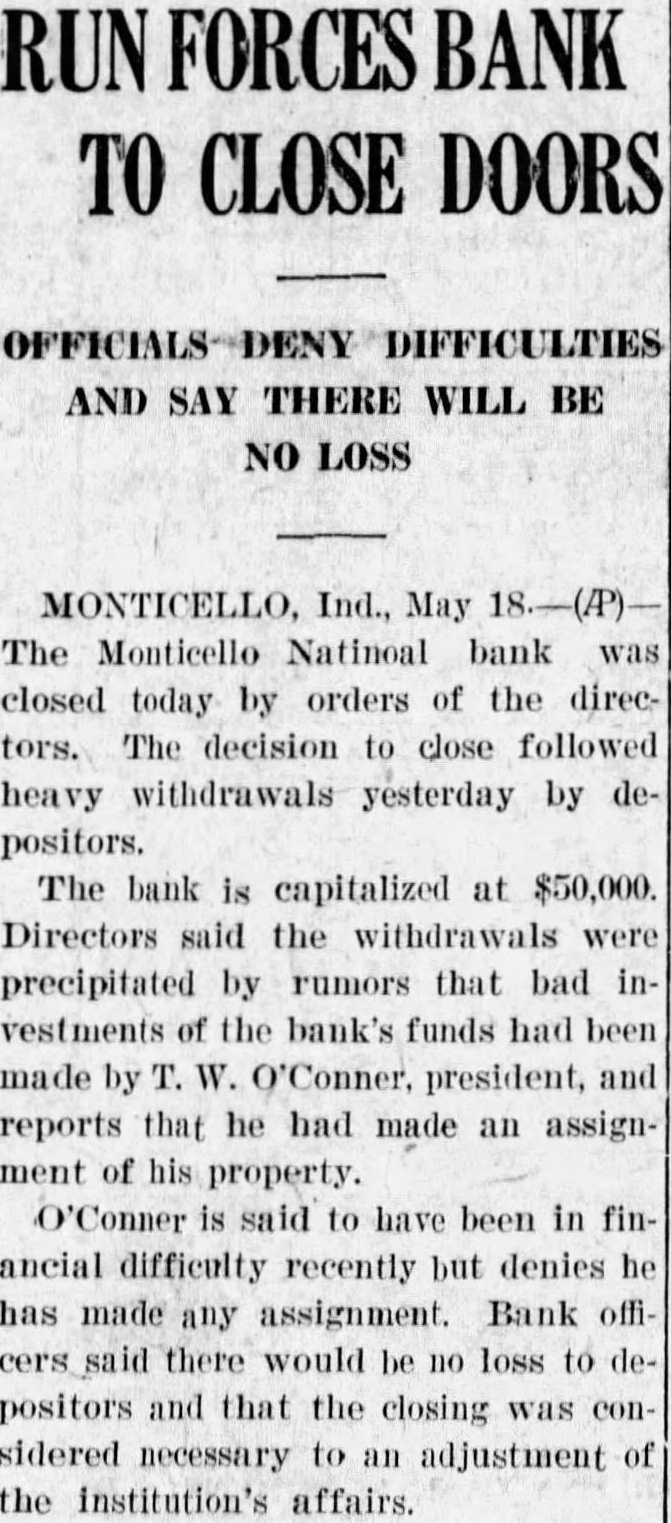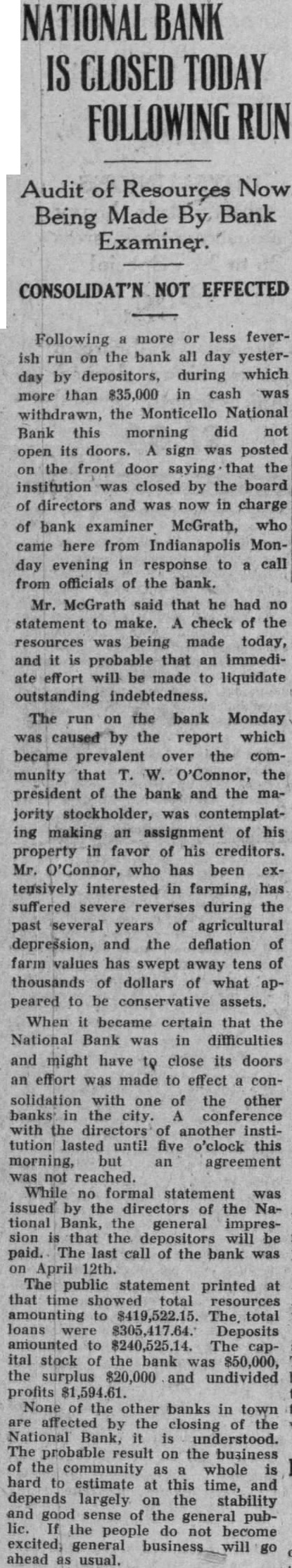 Following a more or less feverish run on the bank all day yesterday by depositors, during which more than $35,000 in cash was withdrawn, the Monticello National Bank this morning did not open its doors. A sign was posted on the front door saying that the institution was closed by the board of directors and was now in charge of bank examiner McGrath, who came here from Indianapolis Monday evening in response to a call from officials of the bank. Mr. McGrath said that he had no statement to make. A check of the resources was being made today, and it is probable that an immediate effort will be made to liquidate outstanding indebtedness. The run on the bank Monday was caused by the report which became prevalent over the community that T. W. O'Connor, the president of the bank and the majority stockholder, was contemplating making an assignment of his property in favor of his creditors. Mr. O'Connor, who has been extensively interested in farming, has suffered severe reverses during the past several years of agricultural depression, and the deflation of farm values has swept away tens of thousands of dollars of what appeared to be conservative assets. When it became certain that the National Bank was in difficulties and might have to close its doors an effort was made to effect a consolidation with one of the other banks in the city. A conference with the directors of another institution lasted until five o'clock this morning, but an agreement was not reached. While no formal statement was issued by the directors of the National Bank, the general impression is that the depositors will be on April 12th. The public statement printed at that time showed total resources amounting to $419,522.15. The total loans were $305,417.64. Deposits amounted to $240,525.14. The cap- a ital stock of the bank was $50,000, the surplus $20,000 and undivided profits $1,594.61. None of the other banks in town are affected by the closing of the National Bank, it is understood. The probable result on the business of the community as a whole is hard estimate at this time, and depends largely on the stability and good sense of the general public. If the people do not become excited, general business will go ahead as usual.