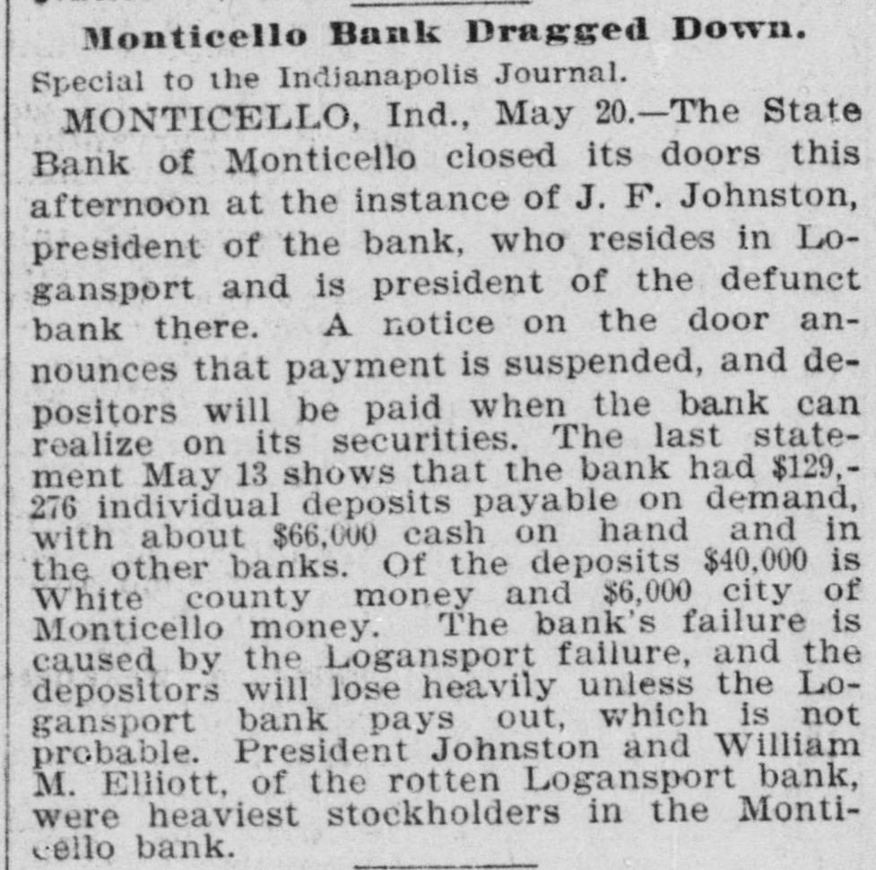 Monticello Bank Dragged Down. Special to the Indianapolis Journal. MONTICELLO, Ind., May 20.-The State Bank of Monticello closed its doors this afternoon at the instance of J. F. Johnston, president of the bank, who resides in Logansport and is president of the defunct bank there. A notice on the door announces that payment is suspended, and depositors will be paid when the bank can realize on its securities. The last statement May 13 shows that the bank had $129,276 individual deposits payable on demand, with about $66,000 cash on hand and in the other banks. Of the deposits $40,000 is White county money and $6,000 city of Monticello money. The bank's failure is caused by the Logansport failure, and the depositors will lose heavily unless the Logansport bank pays out, which is not probable. President Johnston and William M. Elliott, of the rotten Logansport bank, were heaviest stockholders in the Monticello bank.