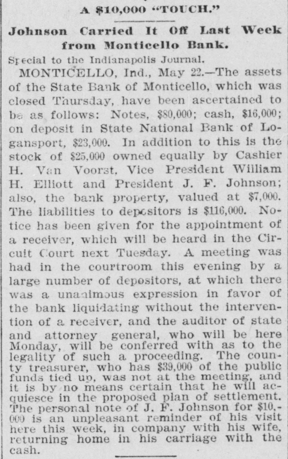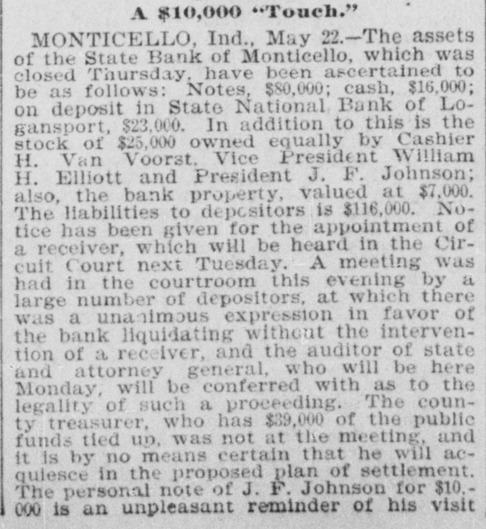 A $10,000 "Touch." MONTICELLO, Ind., May 22.-The assets of the State Bank of Monticello, which was closed Thursday, have been ascertained to be as follows: Notes, $80,000; cash, $16,000; on deposit in State National Bank of Logansport, $23,000. In addition to this is the stock of $25,000 owned equally by Cashier H. Van Voorst. Vice President William H. Elliott and President J. F. Johnson; also, the bank property, valued at $7,000. The liabilities to depositors is $116,000. Notice has been given for the appointment of a receiver, which will be heard in the Circuit Court next Tuesday. A meeting was had in the courtroom this evening by a large number of depositors, at which there was a unanimous expression in favor of the bank liquidating without the intervention of a receiver, and the auditor of state and attorney general, who will be here Monday, will be conferred with as to the legality of such a proceeding. The county treasurer, who has $39,000 of the public funds tied up, was not at the meeting, and it is by no means certain that he will acquiesce in the proposed plan of settlement. The personal note of J. F. Johnson for $10.000 is an unpleasant reminder of his visit