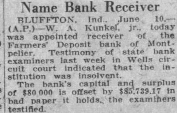 When the Union Savings & Trust Company of Bluffton failed to open its doors today, the panic spread from Wells county to Blackford county and forced the farmers deposit bank Montpelier close. Meanwhile the board of directors of the Citizens National Bank at Bartholomew county, ordered the bank closed today after Utt, federal bank examiner found an leged $100,000 shortage in the counts of Cashier Stewart. The seven banks closed in Indiana since yesterday morning and their deposits follow: Well County State Bank of Bluffton, $1,250,000. Union Savings Trust Company Bluffton, $400,000. Uniondale State Bank of Uniondale, $230,000. Liberty Center State Bank of Center, Bank of Petroleum at Petroleum, $155,000. Farmers Deposit Bank of Montpelfier, $610,000. Citizens National Bank of Hope, $400,000.