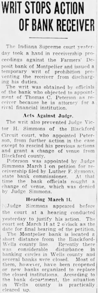 The Indiana Supreme court yester day took hand in receivership proceedings against the Farmers' Deposit bank of Montpelier and issued temporary writ prohibition preventing the receiver from discharg his duties. The writ was obtained by officials of the bank who objected to appoint ment Thomas C. Peterson as because he for a attorney rival financial institution. Acts Against Judge The writ also prevented Judge Vic. tor H. Simmons of the Blackford Circuit court. who appointed Peterson, from further action in the case except to rescind his previous actions and grant change of venue from Blackford Peterson appointed by Judge Simmons March on petition for ceivership filed by Luther Symons, state bank commissioner. At time the bank officials sought change of which was denied by Judge