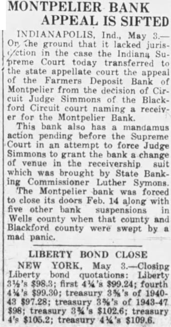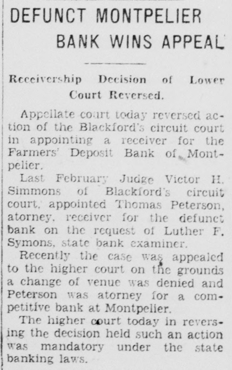 DEFUNCT MONTPELIER BANK WINS APPEAL Receivership Decision of Lower Court Reversed. Appellate court today reversed action of the Blackford's circuit court in appointing a receiver for the Farmers' Deposit Bank of Montpelier. Last February Judge Victor H. Simmons of Blackford's circuit court. appointed Thomas Peterson, atorney, receiver for the defunct bank on the request of Luther F. Symons, state bank examiner. Recently the case was appealed to the higher court on the grounds a change of venue was denied and Peterson was atorney for a competitive bank at Montpelier. The higher court today in reversing the decision held such an action was mandatory under the state banking laws.