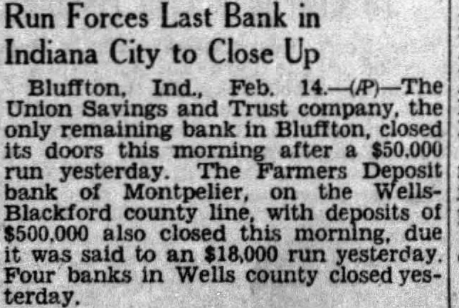 BLUFFTON, Ind., Feb. Union Savings Trust Company, only remaining bank in Bluffton, closed morning after $500,000 run yesterday. The Farmers Deposit Bank of Montpelier also closed today, due, was said here, to a $500,000 run yesterday. Four banks in Wells county closed yesterday. President Fred Tangeman, of the Union Savings Trust Company, said his bank was solvent, and he hoped to reopen the institution after the usual sixty days for reorganization.