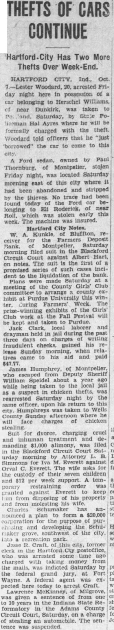 HARTFORD CITY, Ind., Oct. Woodard, arrested Friday night here in possession of car belonging to Herschel Williams, near Dunkirk, was taken to Saturday, by State Policeman Hal Ayres where he will be formally charged with the theft. Woodard told officers that he "just "borrowed" the car to come to this city. Ford sedan. owned by Paul Thornburg. of Montpelier, stolen Friday night, was located Saturday morning east of this city where had been abandoned and stripped by the thieves. No trace had been found today Ford car belonging to Eli Roderick, of near Roll, which was stolen early this week. The machine was insured. Hartford City Notes. Kunkle, Bluffton, ceiver for Farmers Deposit Bank. Montpelier, Saturday morning filed suit in the Blackford Circuit Court against Albert Hart, on notes. The suit is the first of promised series of such incident to the of the bank. Plans of the County Girls' Club meeting to county exhibit at Purdue University this winFarmers' Week. The ter, Curing exhibits of the Girls' Club work the Fall Festval will kept and taken to Purdue. Jack Clark, local laborer and drayman held in jail during the past three charges writing fraudulent checks. gained his lease Sunday morning, when relatives came to his aid and paid $47.77. James Humphrey, of Montpelier, from Deputy Sheriff Speidel about year ago while being taken to the local jail suspect in chicken thefts, was rearrested night by the officer. upon his return to this city. Humphreys was taken to Wells County Sunday afternoon he will face charges chicken stealing. Suit dvorce. charging cruel inhuman treatment and demanding alimony, was filed the Blackford Circuit Court Saturday morning Attorney Simmons for Everett against Orval Everett. The wife asks for the custody of their seven children and $12 week support. temrestraining order was granted against Everett keep from disposing of his property from molesting his wife. Charles Schumaker has announced plan to form $20,000 corporation for the purpose of purchasing and developing the Schumaker grove, southwest of the city, park. R. Craft. this city, former clerk the Hartford Cty postoffice, some time ago charged with taking money from mails, indicted Saturday by federal grand jury, at Fort Wayne. federal agent was expected here today to arrest Craft. McKinney, Milgrove, was given sentence of from years in the Indiana State formatory in the Adams County Circuit Court, Saturday, on charge an automobile. The sentence was suspended.