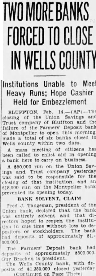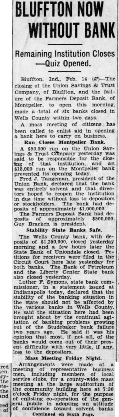 Bluffton. Ind., Feb. 14 closing of the Union Savings Trust Company, of Bluffton, and the failure of the Farmers Deposit Bank. of Montpelier, to open this morning, made total of six banks closed in Wells County within two days. mass meeting of citizens has A been called to enlist aid in opening bank carry on business. Run Closes Montpelier Bank. on Union SavTrust Company was responsible the closing that institution, the Montpelier bank prevented its opening Fred Tangeman, of the Union Bank, that the bank entirely solvent that direcreopen the institution time without depositors The bank had posits The Deposit Bank had posits $500,000. Guy Bracken president. Stability State Banks Safe. The Wells County bank, with posits of closed and few hours later the State Uniondale closed. titions for filed in the Circuit Court here late Bank Petroleum and the Liberty Center State bank closed Luther Symons, state bank commissioner, statement issued Indianapolis today, declared that the stability the banking situation state should not affected various banks Wells County. here had been brought by continual agitation banking growing years said his opinion most, not the banks come out their with little, any, to the depositors. Mass Meeting Friday Night. were of members local service clubs. mass meeting the large auditorium building here Friday night, purpose enlisting the public adopting attitude of confidence toward solvent banks Continued Sixth Page.