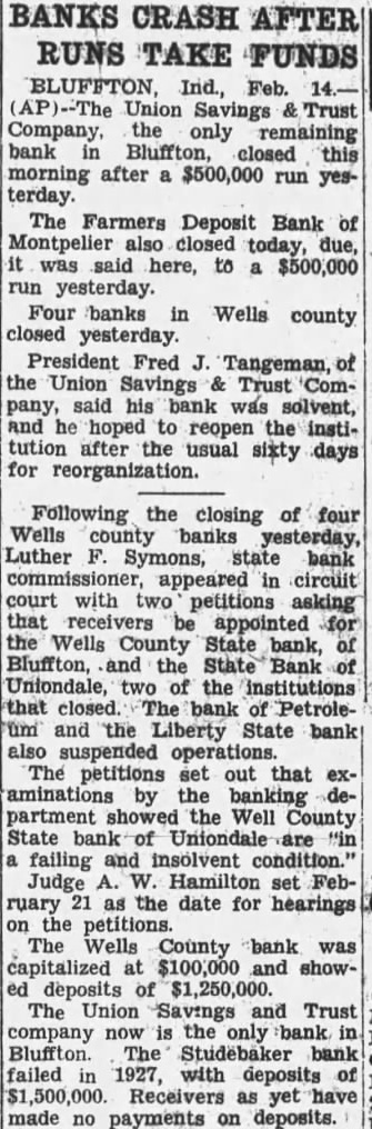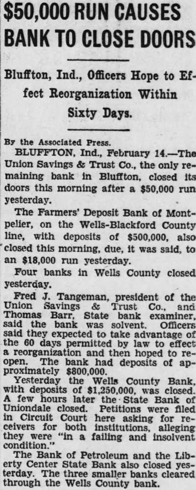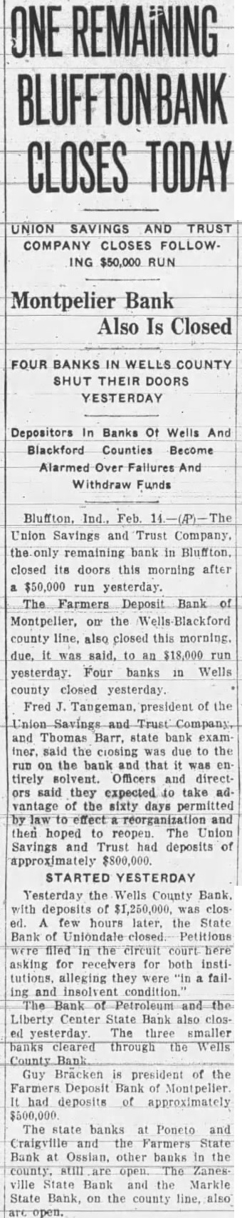 Associated BLUFFTON, Ind., Feb 14. The Union Savings & Trust company, the only remaining bank in Bluffton, closed its doors this morning after Wednesday. The Farmers Deposit bank of Montpelier, on the Wells-Blackford county line, also closed this morning. said to Wednesday. Four in Wells county closed Wednesday Fred president of the Union Savings Trust company, and Thomas state bank examiner, said the closing was due to the run on the bank and that was entirely solvent. Officers and directors said they expected to the 60 days permitted by effect and then hoped to reopen. The Union Savings Trust had deposits of approxiWednesday the Wells County bank, with deposits of closed. few hours later the bank Uniondale closed. Petitions were filed in circuit court here asking for ceivers for both institutions, alleging they were failing and insolvent condition. The Bank Petroleum and the Liberty Center State bank also closed Wednesday. The smaller banks cleared through the Wells County Guy Bracken is president of the Farmers Deposit of Montpelier. had deposits of approximately The state banks at Poneto and Craigville and the Farmers State bank Ossian, other banks in the county, still are open.
