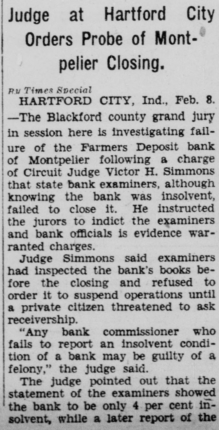 Judge at Hartford City Orders Probe of Montpelier Closing. R.V. Times Special HARTFORD CITY, Ind., Feb. 8. -The Blackford county grand jury in session here is investigating failure of the Farmers Deposit bank of Montpelier following a charge of Circuit Judge Victor H. Simmons that state bank examiners, although knowing the bank was insolvent, failed to close it. He instructed the jurors to indict the examiners and bank officials is evidence warranted charges. Judge Simmons said examiners had inspected the bank's books before the closing and refused to order it to suspend operations until a private citizen threatened to ask receivership. "Any bank commissioner who fails to report an insolvent condition of a bank may be guilty of a felony," the judge said. The judge pointed out that the statement of the examiners showed the bank to be only 4 per cent insolvent, while a later report of the