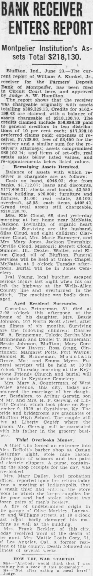 Bluffton, Ind., June current report of William A. Kunkel, Jr., receiver for the Farmers' Deposit Bank of Montpelfer, has been filed Circuit Court approved Judge A. W. Hamilton. The report shows that the receiver was chargeable originally with assets totalling Credits for $162.are claimed. with balance of assets chargeable of The credits $58,886.39 paid to in two distributions of 10 per cent each; preferred claims paid; expenses of ceiver, fees of $3,450 for the receiver and similar sum for the receiver's attorneys: assets compromised and items of set-offs, real estate sales below listed values, and below listed values. Remaining Assets Itemized. Balance of assets with which receiver chargable follows Cash on hand. due from banks. loans and discounts, stocks and bonds, $3,550; bank building. and fixtures. real estate, overdraft cash items. $405 Grand total assets chargeable, Mrs. Elle Cloud. 68, died yesterday morning home near McNatts. Jackson Township. of organic heart trouble Surviving are the husband, Silas Cloud. and eight children: Clarence Cloud, Mrs. Marie Ramseyer and Mrs Mary Jones, Orville Cloud. Missouri Cloud, ton Cloud. all of Bluffton. Funeral services will be held at Union Chapel, McNatts. o'clock Tuesday afternoon. Burial will be in Jones CemIval Young. local butcher. escaped serious injury last night his car left the highway at the County in the ditch. The machine was badly damaged.