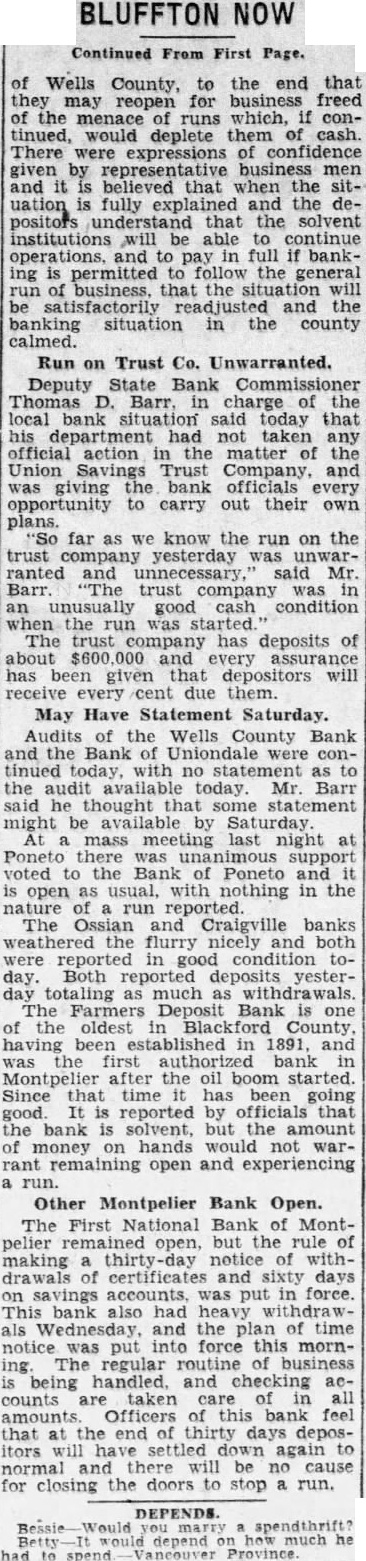 This action which followed run the bank in which were paid out, left the City of Bluffton temporarily without bank and Wells county with only three banking institutions, those at Ossian Craigville and Poneto. The closing of the bank was tirely voluntary on the part of the bank officials who explained it was being done to the excited pubtime to draw its breath." The development came while five state bank examiners headed Thomas Barr. Assistant State Banking Commissioner, were on the scene. "Everyone seems to have lost his sense of proportion," Barr said. "Yesterday's run on the Union Savings Trust company was perfectly unjustified. The bank put out $50,000 and was offered $50,000 more to tide over today but directors didn't think they had