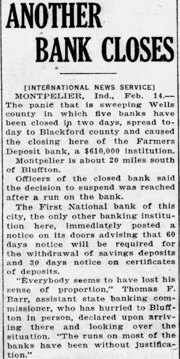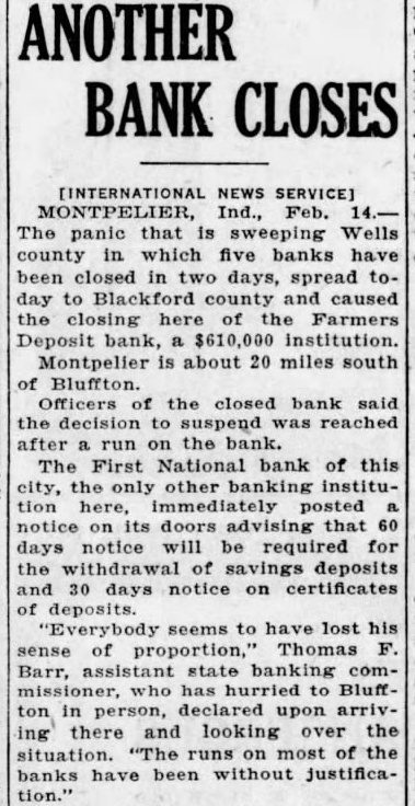 BULLETIN MONTPELIER, Ind., Feb. panic that sweeping Wells in which five banks county have been closed in two days, spread today to Blackford county and caused the closing here of the Farmers Deposit bank, $610,000 institution. Montpelier about 20 miles south of Bluffton. Officers of the closed bank said the decision to suspend was reached after run on the bank. The First National Bank of this city, the only other banking institution here, immediately posted notice on its doors advising that days notice will be required for the withdrawal savings deposits and 30 days notice on certificates deposits.