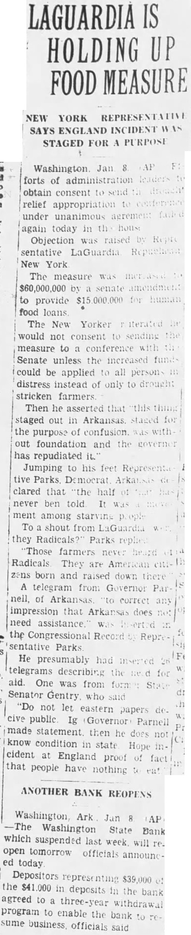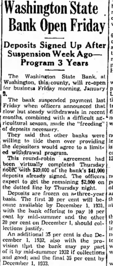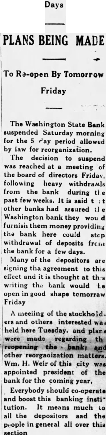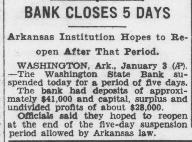 Bank Suspends for 5 Days. WASHINGTON. Ark., Jan. Washington State Bank suspended Saturday for period of five days. The bank had deposits of approximately $41 000 and capital. surplus and undivided profits of about $28,000.