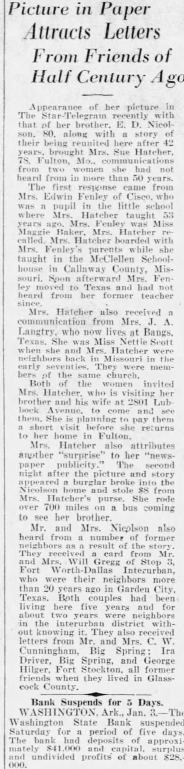 Appearance of her picture in The Telegram recently with that of her brother. E. D. Nicolson. 80. along with a story of their being here after 42 brought Mrs. Sue Hatcher. 78. Fulton, Mo., communications from two women she had not heard from in more than 50 years. The first response came from Mrs. Edwin Fenley of Cisco. who was pupil in the little school where Mrs. Hatcher taught 53 years ago. Mrs. Fenley was Miss Maggie Baker, Mrs. Hatcher recalled. Mrs. Hatcher boarded with Mrs. Fenley's parents while she taught in the McClellen Schoolhouse in Callaway County, Missouri. Spon afterward Mrs. Fenley to Texas and had not heard from her former teacher Mrs. Hatcher also received communication from Mrs. J. A. Langtry. who now lives at Bangs, Texas. She was Miss Nettie Scott when she and Mrs. Hatcher were neighbors back in Missouri in the early seventies. They were members of the same church. Both of the women invited Mrs. Hatcher, who is visiting her brother and his wife at 2801 Lubbock to come and see them. She is to pay them short visit before she returns to her home in Fulton. Mrs. Hatcher also attributes another "surprise" to her "newspaper publicity The second night after the picture and story appeared a burglar broke into the Nicolson home and stole $8 from Mrs. Hatcher's purse. She rode over 700 miles on a bus coming to see her brother. Mr. and Mrs. Nieplson also heard from a number of former neighbors as result of the story. They from Mr. and Will Gregg of Stop 3, Fort Worth- Dallas Interurban, who were their neighbors more than 20 years ago in Garden City, Texas. Both couples had been living here five years and for about two years were neighbors in the interurban district without knowing it. They also received letters from Mr. and Mrs. C. W. Cunningham, Big Spring: Ira Driver, Big Spring, and George Hilger. Fort Stockton. all former friends when they lived in Glasscock County.