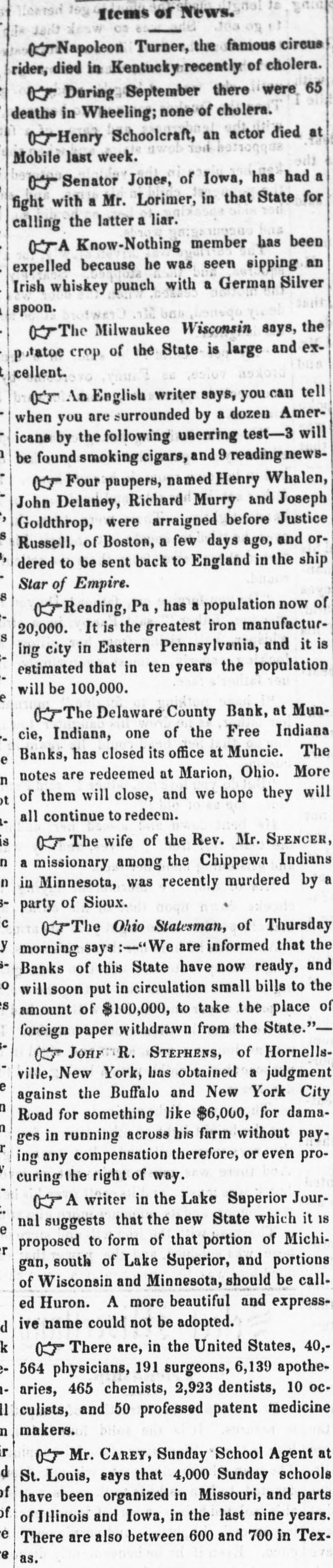 The latest bulletin in regard to the Indiana Banks The latest bulletin in regard to the Indiana Banks is the fellowing letter from Indianapolis: INDIANAPOLIS Sistarday, Nov 4 1854. JOHN THOMPSON, Eq No. Wall-st., New York. Dear Sir: Having during the last two weeks visited most of the priccipal towns of this State, to ascertain the position of the Free Banks, I am sorry to have to state that nearly the whole of them have suspended specie payment and many of the accessible ones already protested. Of the owners of the Free Banks large number of whom are in this city, I regret to say that some entire ly disown any connection with banks that are currently reported to belong to them, and as some of these banks are incossible and others have only a nominal place of business, it becomes almost an impossibility to get the notes protested, and as it is well known that the banks have stopped specie payment, what ecourse have the bill holders? The following banks have protested to my certain knowledge, and others I will report to you as fast 88 I learn the fact. Merchants Bank. of Lafayerte: Wayne Bank. of Logansport; State Stock of Pean.; Eikhard's Co. Bank; Batk of Connersville. &c. Of the State Stock Bank of Logansport could find no office, no owner, nor anybody that know suything aboutit. The Cashier of the Northern Indians Bank . Lo. gansport I had heard asserted would redeem 183 to tos, but n presentation be very liberally offered me fifty cents on the dollar for them, which I declined. Ofthose banks situated in the remote swampy diatriets of the State, such as the Bank of America, as Morocco, the Wabash River Bank, at Jasper, see., I am not yet able to say anything, nobody, to my knowledge, having yet penetrated to them. I presume, however, they have stopped ment; the 0 wner of one of these, residing in this city, and declining to take up his notes, favors this conviction. The bonks of this city still continue to redeem, although the owner of one last night said he intended to stop redeeming to brokers. Atpresent I know of only about twelve banks that redeem. The Auditor has declared that notes protested in packages will not ereceived by him, as the only legal way is to protest them singly, thus rendering useless the protests on some of the banks above mentioned, hich were deno in packages. Of the Delaware County Bank, said to be at Muncio, I can discover no officer nor owner. Banks of this class are numerous, as are also those like Wayne Bank, which we were recommended to a saw-mill to find, and the Newport Banks, three of which are in the County Clerit's office. There is now scarcely a dellar in the State except Free Bank paper, all else being engerly seized to reS. C. THOMPSON. Yours, mit East. Mr. John Rice has been elected President of the Atlantic Bank of this City, vice Mr. Isaac Otis, resigned. Mr. J. W. Baker was elected Vice-Prosident. Mr. Patchin, we understand, promises to pay the Coupons on the Bonds of the Buffalo and New-York City Road, due in July, within the next thirty days. There is no important change in the Money market, but if any, it is not in greater ease. The Banks continue to contract their loans, and while this continues but little relief can be looked for. Exchanges, however, are in favor of this City from all the prominent potnis, and but for the trouble among the Western Banks, we should expect a let up to some extent within a week or two. The rates for paper are without change. At Boston, the Money market continues easier. At Baltimore, The Sun says: The hopes of some improvement in money metters this week stimulated speculators to make time purchases of stocks to 8 rather greater extent at the close of last week, and that helped the market somewhat. The effect of last week's stringency and the heavy payments on Saturday led to the suspension of three or four houses in Baltimore, some of which, however, showing ample assets, may only need an extension whereby to continue the conduct of their businees." At Detroit, according to The Journal The difficulty of obtaining money has never been 80 great as at present. Banks and brokers have nearly stopped discounts, and accommodations are not to be had at any price. The best securities are mostly refused, and every one is content to let his neighbor take care of himself, if possible. Heavy speculations are consequently out of the reach of most dealers, and operations have been restricted to such as will bring the quickest return. The Chronicle, of Pittsburgh, says: The Money market during the last week was probably more stringent than has been experienced in this city for four or five years. The rate for money now on the street may be set down at 11 P month for strictly No. 1, and various rates for other grades. The discount on currency fluctuates between 11@2. Eastern Exchange and par funds are very searce. The report against the Commercial and Farmers Bank at Paducah, Ky., we have reason to think, was without foundation, and the brokers generally are receiving it on deposit." The following semi-annual dividends have been declared by the Philadelphia banks. The Bank of North America and the Pennsylvania Bank divide in January and July. Northern Liberties Bank, 6 P cent.; Philadelphia Bank, 5; Mechanics' Bank, 6: Commercial Bank. 5; Kensington Bank, 6; Manufacturers' and Mechanics' Bank, 5; Bank of Commerce, 5; Girard Bank, 3; Western Bank, (extra5, 10; Penn Township Bank, 5; Farmers' and Mechanics' Bank, 5; Tradesmen's Bank, 4; Southwark Bank, 5. The Oswego Palladium says: " We are gratified to hear the report that Mr. E.G. Merrick, whose recent suspension has been anDounced, has made arrragements to resume again. We believe it has not been presumed that Mr. W. was not-able to meet all his obligations, with sufficient time." The Obio banks follow up the attacks upon the position taken by Auditor Dunn of Indians. The Cincinnati Commercial indulges in pleasantries on Mr. Dunn, who may be called " Anti-Ounn." It says: If