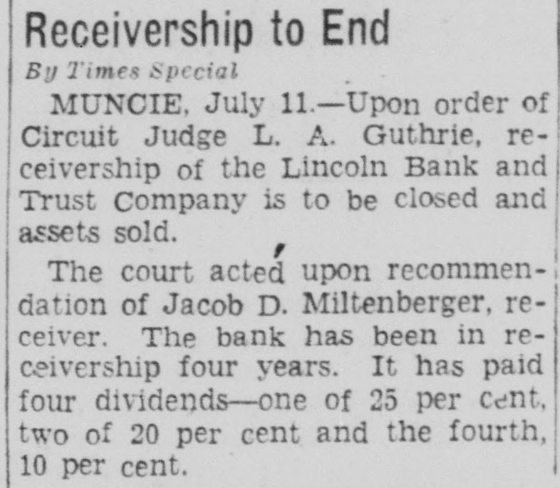 Receivership to End By Times Special MUNCIE, July 11.-Upon order of Circuit Judge L. A. Guthrie, receivership of the Lincoln Bank and Trust Company is to be closed and assets sold. The court acted upon recommendation of Jacob D. Miltenberger, receiver. The bank has been in receivership four years. It has paid four dividends-one of 25 per cent, two of 20 per cent and the fourth, 10 per cent.