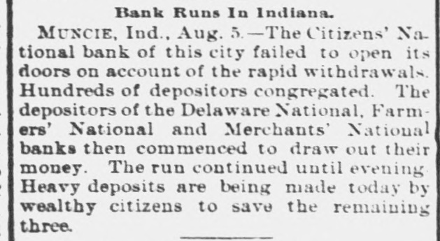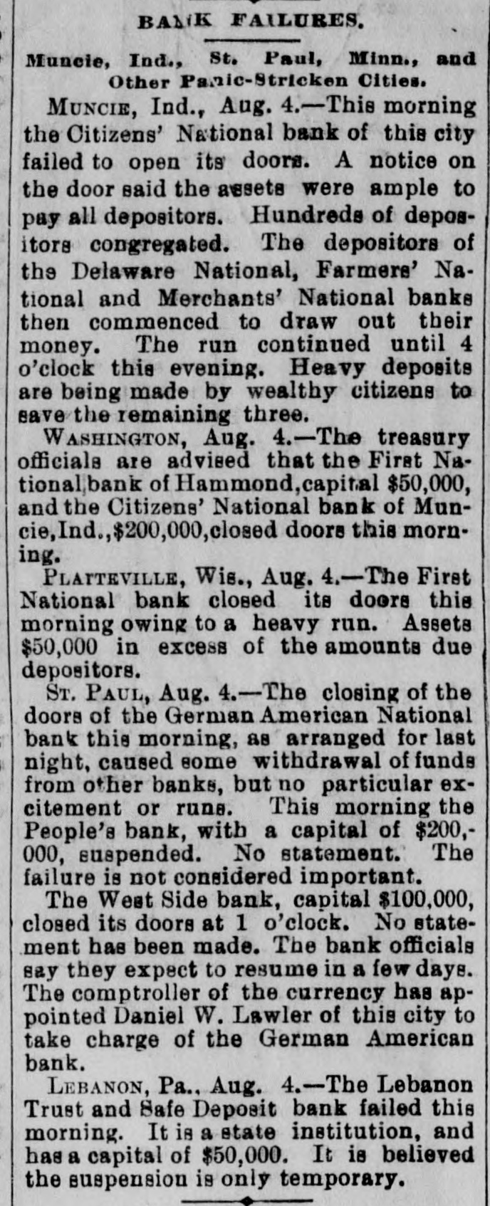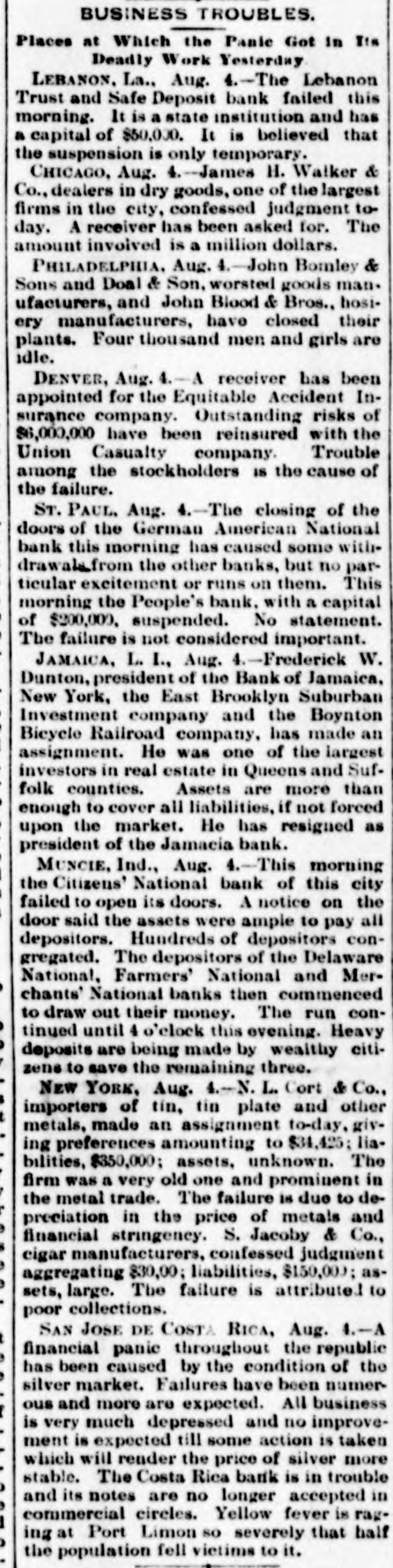 BUSINESS TROUBLES. Places at Which the Panie Got in Its Deadly Work Yesterday LEBANON. La., Aug. 4.-The Lebanon Trust and Safe Deposit bank failed this It is a state a of $50,000. It is morning. capital institution believed and that has the suspension is only temporary. 4. James Co., in one CHICAGO, dealers Aug. dry goods, H. of the Walker largest & firms in the city, confessed judgment today. A receiver has been asked for. The amount involved is a million dollars. PHILADELPHIA. Aug. 4. John Bomley & Sons and Doal & Son. worsted goods man. ufacturers, and John Blood & Bros., hosiery manufacturers, have closed their plants. Four thousand men and girls are idle. DENVER, Aug. 4.-A receiver has been appointed for the Equitable Accident Insurance company. Outstanding risks of $6,000,000 have been reinsured with the Union Casualty company. Trouble among the stockholders IS the cause of the failure. ST. PAUL. Aug. 4. The closing of the doors of the German American National bank this morning has caused some withdrawalsfrom the other banks, but no particular excitement or runs on them. This morning the People's bank. with a capital of $200,000. suspended. No statement. The failure is not considered important. JAMAICA, L. I., Aug. 4.-Frederick W. Dunton, president of the Bank of Jamaica. New York, the East Brooklyn Suburban Investment company and the Boynton Bicycle Railroad company. has made an He was one assignment. of the largest investors in real estate in Queens and Suffolk counties. Assets are more than to cover all liabilities, if not forced the market. He as enough upon has resigned president of the Jamacia bank. 4.-This morning National bank of the MUNCIE. Citizens' Ind., Aug. this city failed to open its doors. A notice on the door said the assets were ample to pay all depositors. Hundreds of depositors congregated. The depositors of the Delaware National, Farmers' National and Mer) chants' National banks then commenced to draw out their money. The run con) tinyed until 4 o'clock this evening. Heavy ) deposits are being made by wealthy citizene to save the remaining three. NEW YORK. Aug. 4.-N. L. Cort & Co., 3 importers of tin, tin plate and other t made an assignment metals, $34,425; to-day.giv- liaing preferences amounting to bilities, $350,000; assets, unknown. The firm was a very old one and prominent in / the metal trade. The failure is due to de: preciation in the price of metals and , financial stringency. S. Jacoby & Co., 8 cigar manufacturers, confessed judgment , aggregating $30,00; liabilities, $150,000; as, sets, large. The failure is attribute. to poor collections. SAN JOSE DE COSTA RICA, Aug. 1.-A t financial panic throughout the republic , has been caused by the condition of the , silver market. Failures have been numerous and more are expected. All business f is very much depressed and no improvement is expected till some action is taken which will render the price of silver more stable. The Costa Rica bank is in trouble ) are no longer accepted in , circles. commercial and its notes Yellow fever is ragI ing at Port Limon so severely that half , the population fell vietims to it.